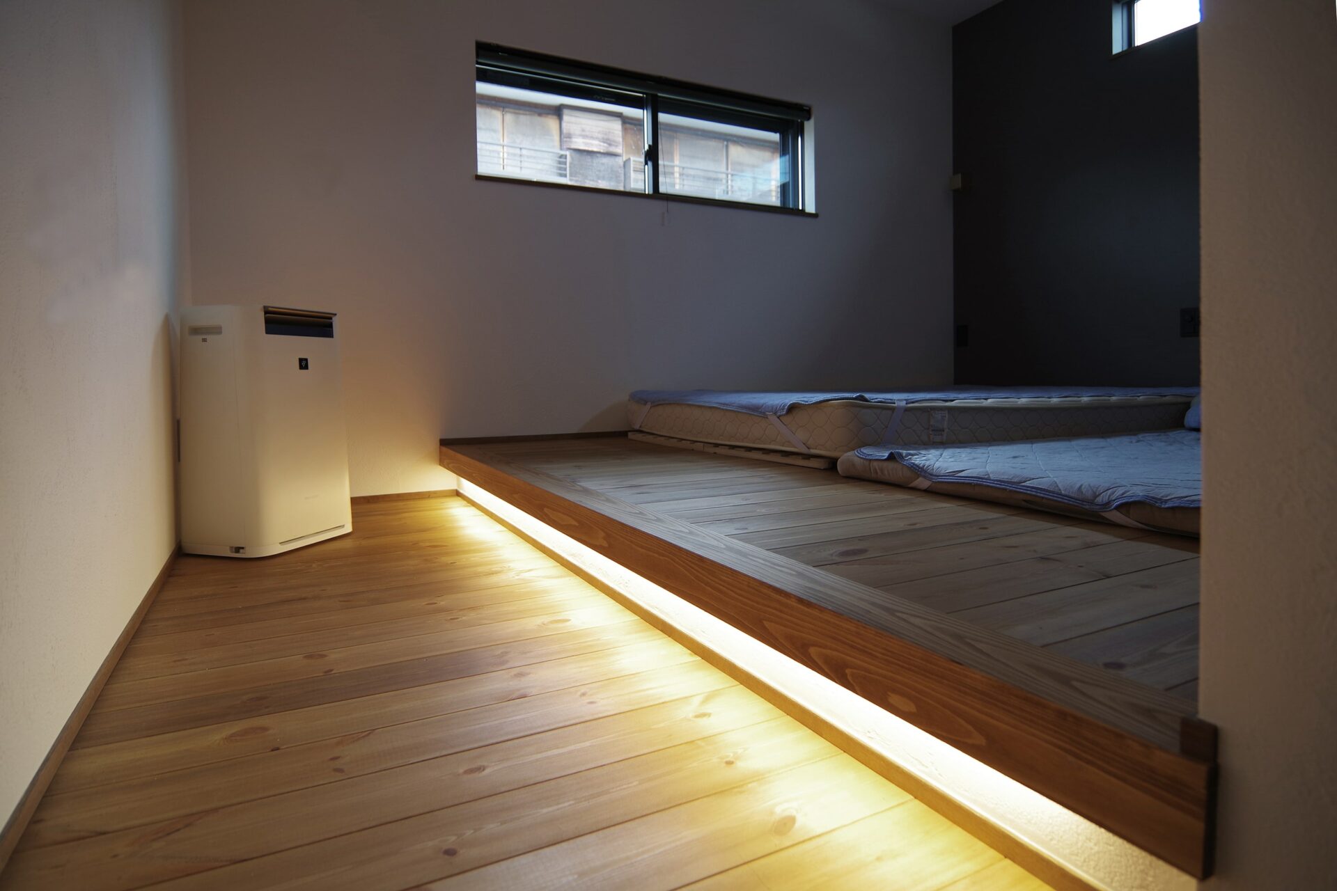 足元を間接照明で照らす寝室。寝室は一階にあり、生活動線はすべてフラットとなり平屋のような使い方ができます。
