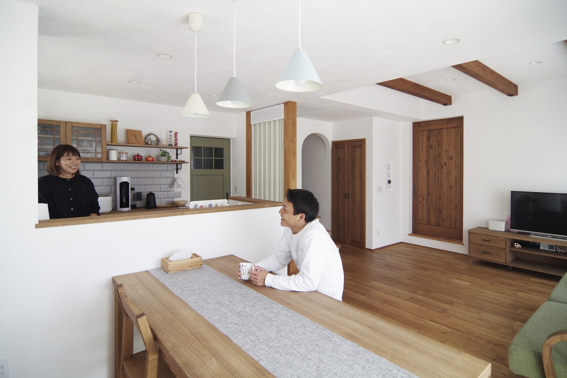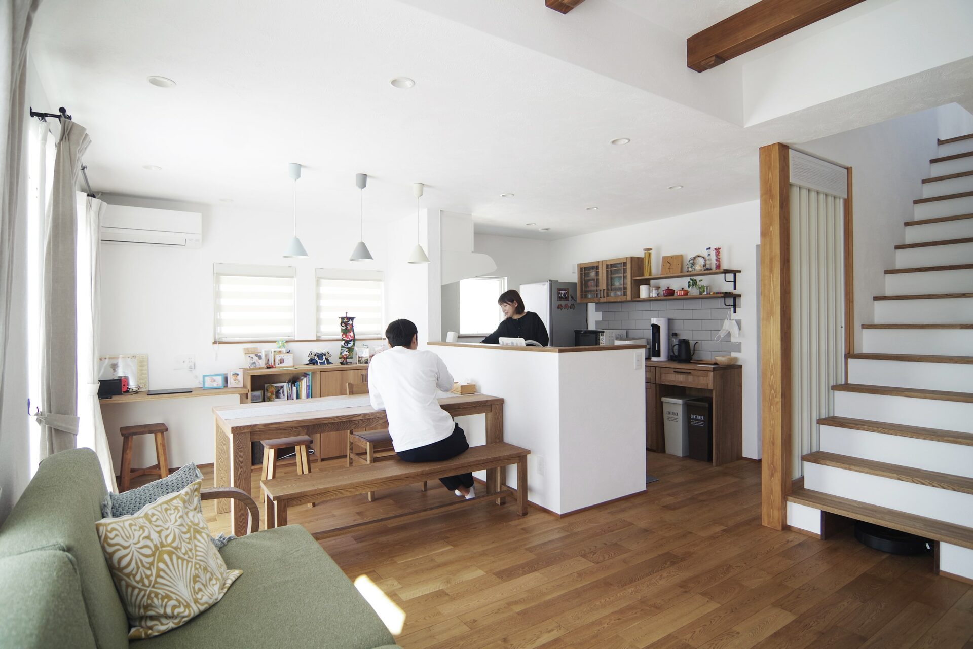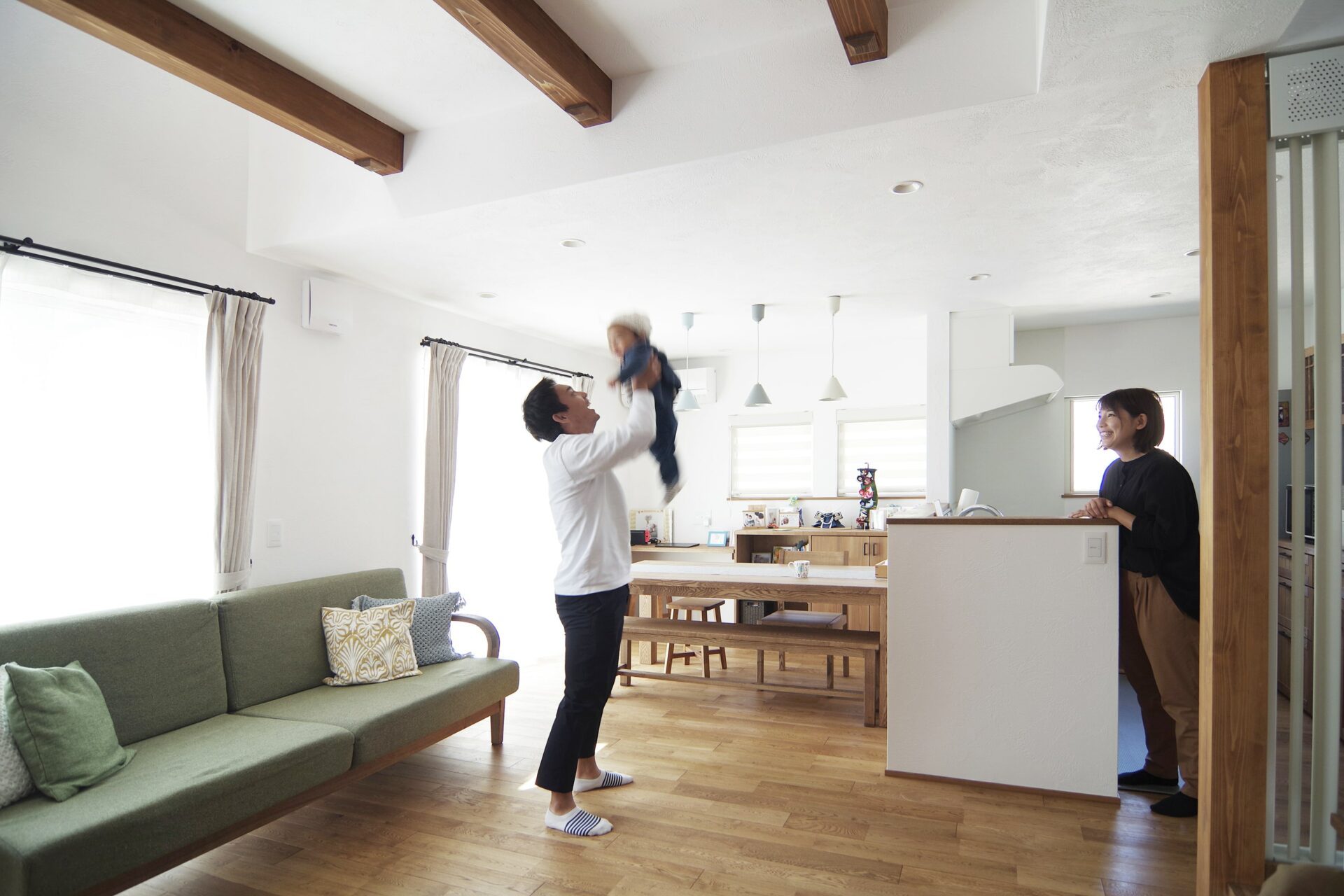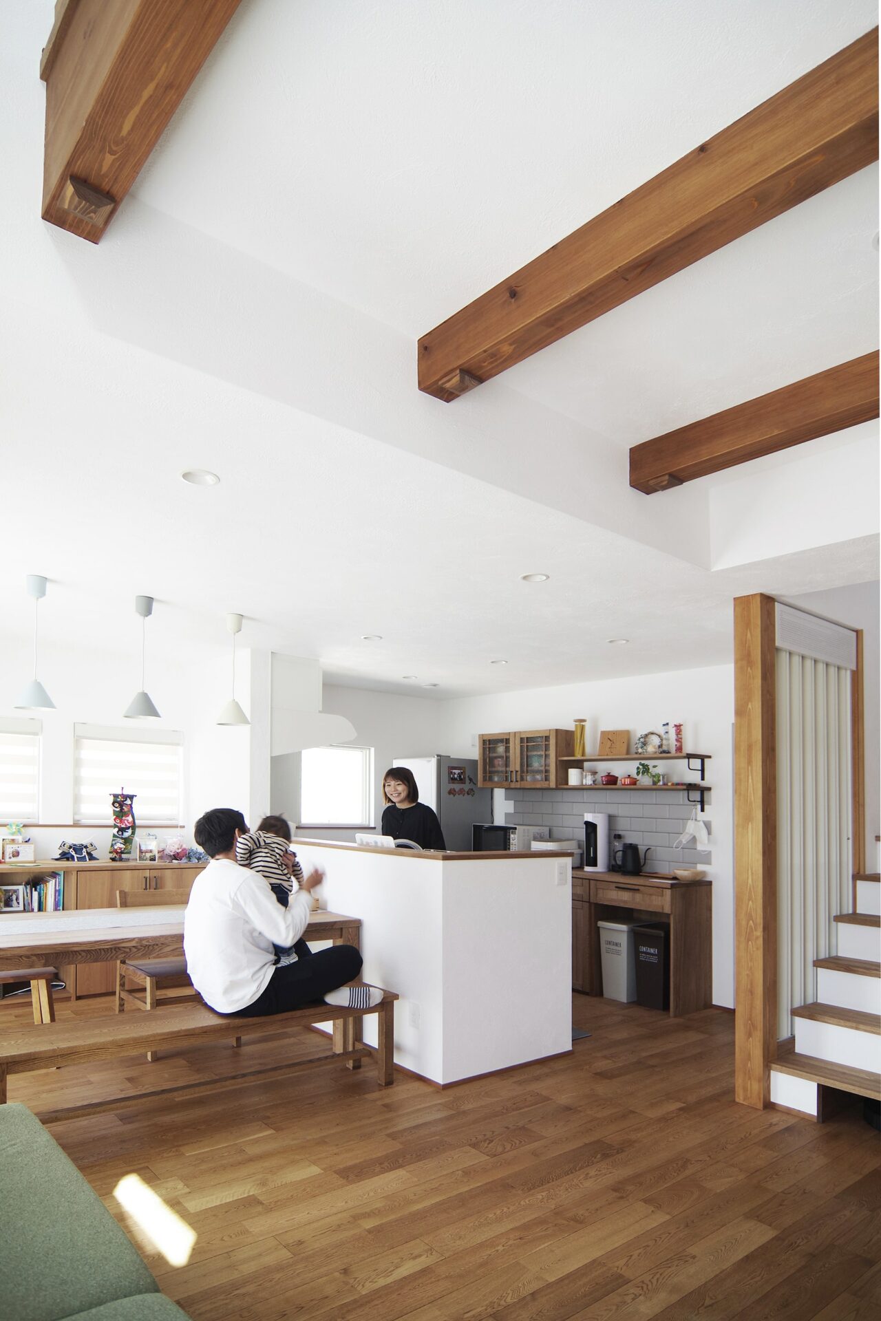 リビングは梁を見せた二段天井で空間にメリハリを持たせました。床はナラ無垢、壁天井は漆喰で自然素材のやさしい空気感です。