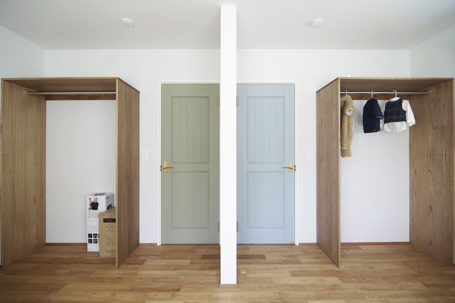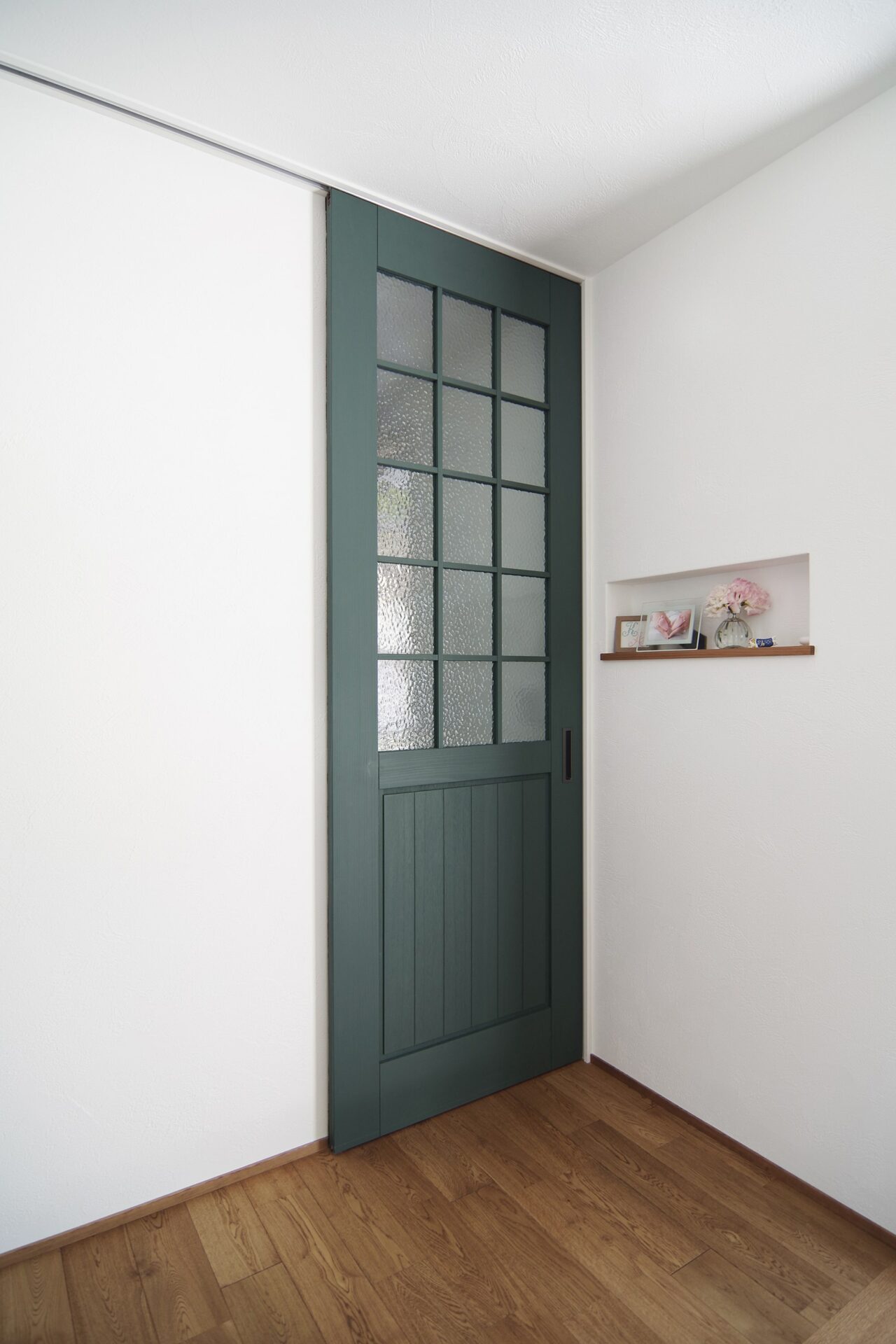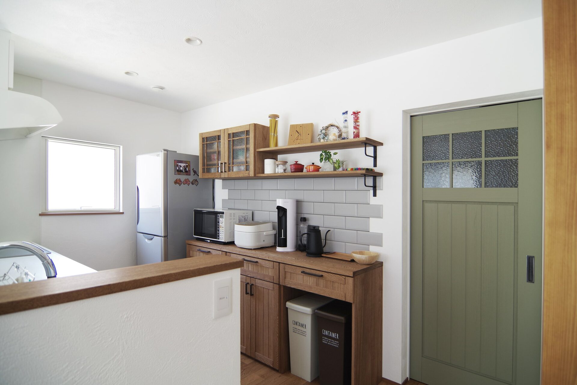 造作のキッチン背面収納。モスグリーンの建具は空間のアクセントに。