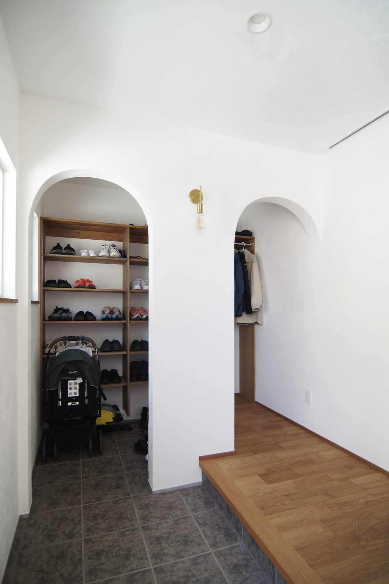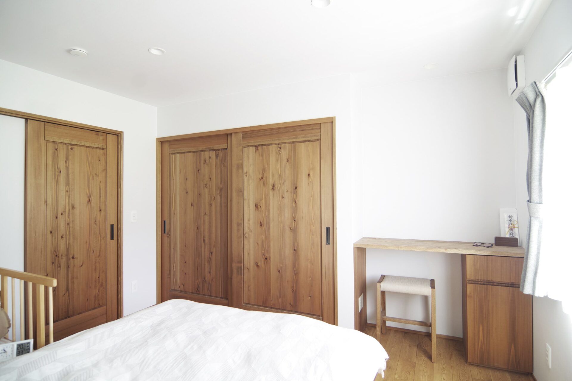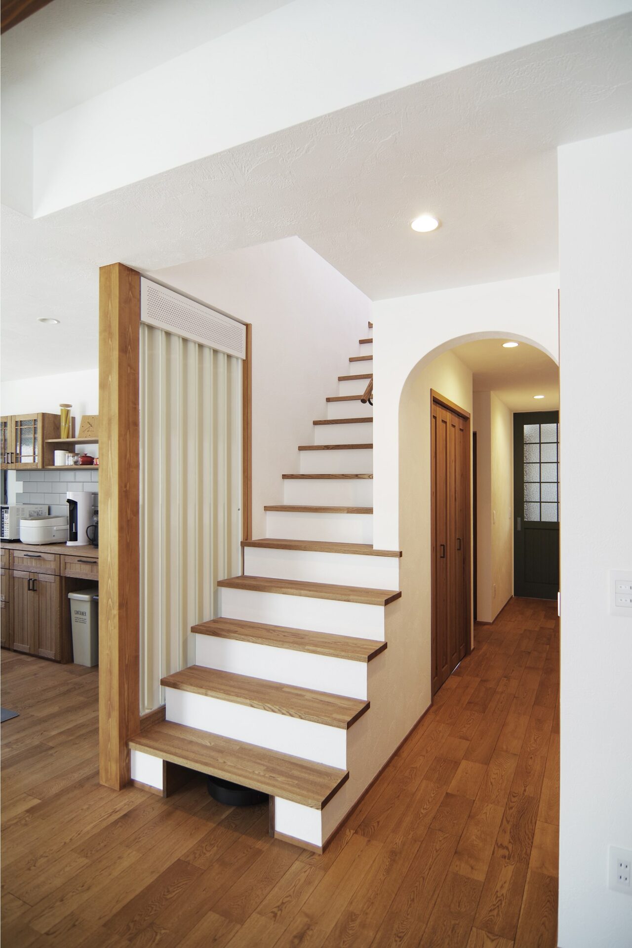 リビングにある階段は玄関から個室までの間に必ずリビングを通るので家族間のコミュニケーションの機会が増えます。また、階段横の白いパネルは、一台のエアコンで家全体を暖める輻射式冷暖房パネル。輻射熱で暖めるから冬は春の陽だまりのようにぽかぽか、夏は鍾乳洞のようにひんやり^^