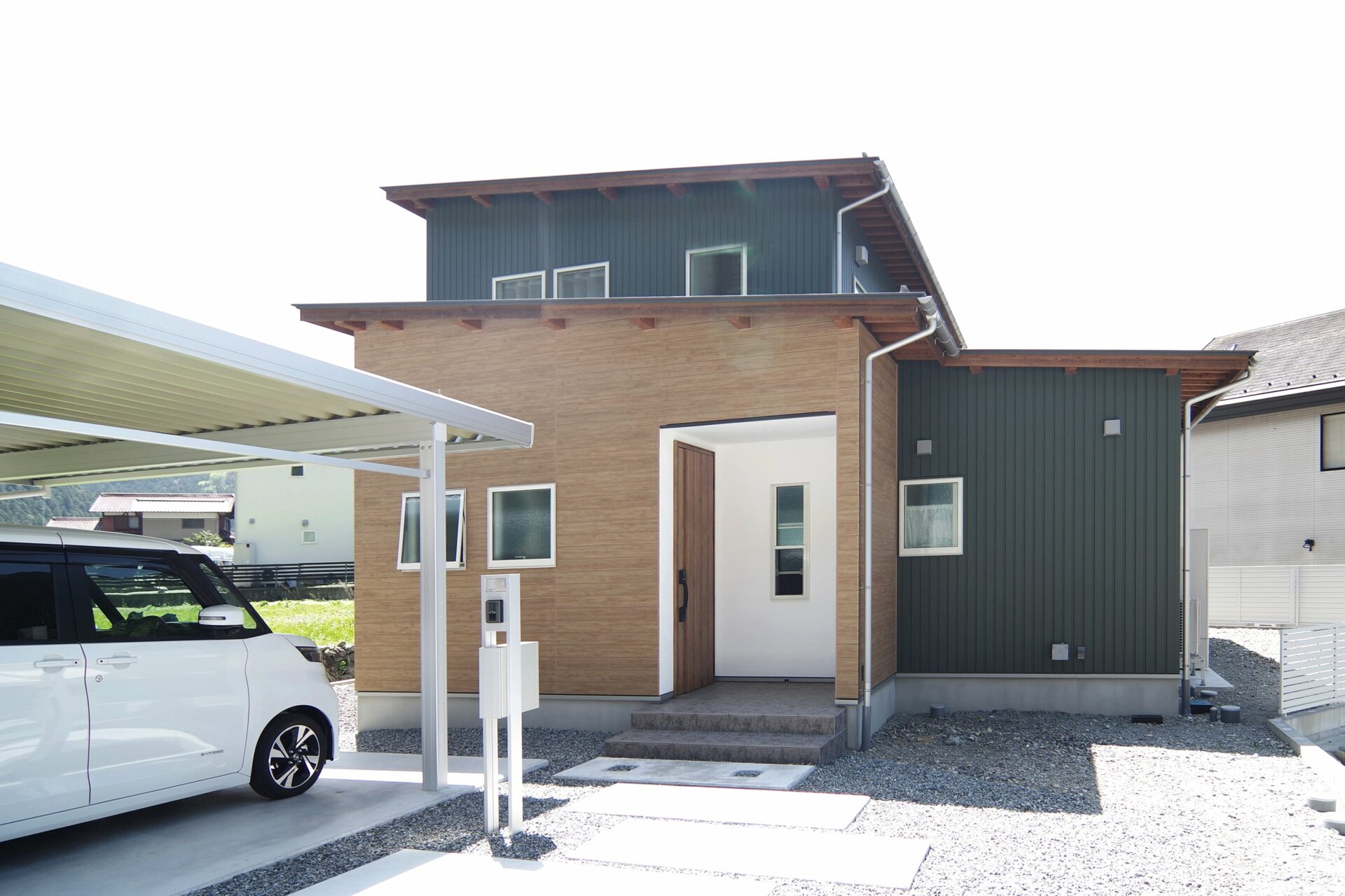 下呂の山々とよくなじむモスグリーンのガルバリウムの外観です。