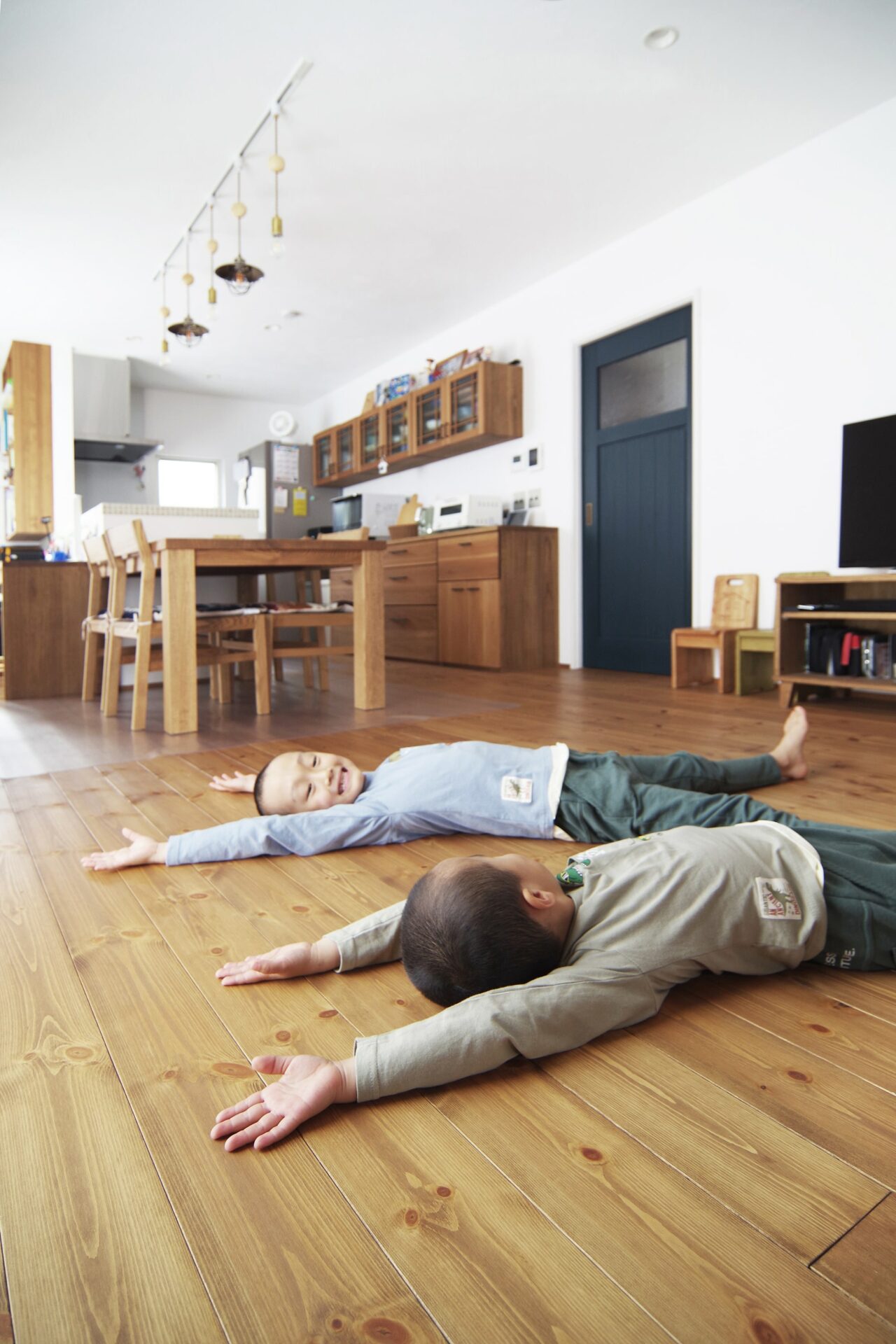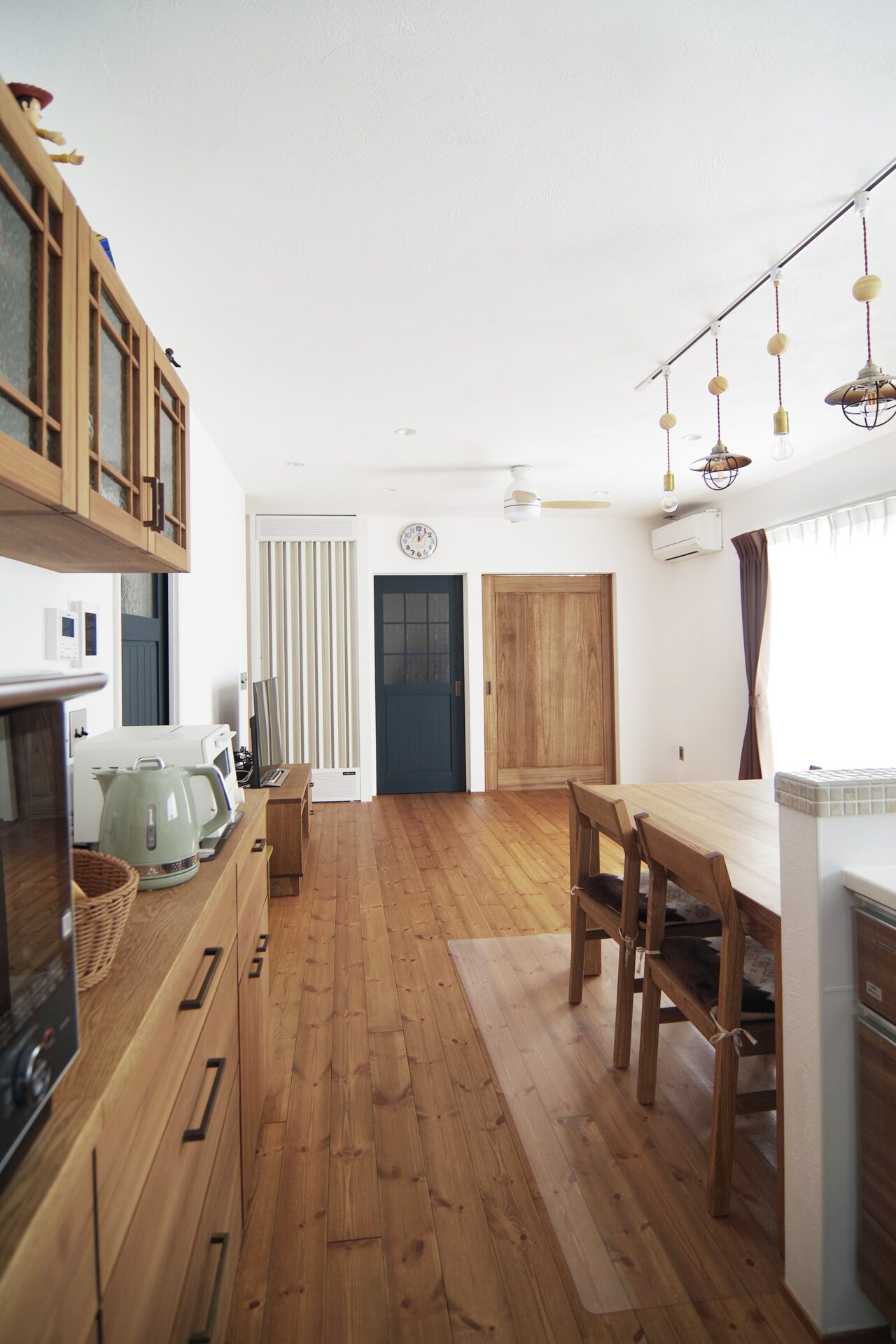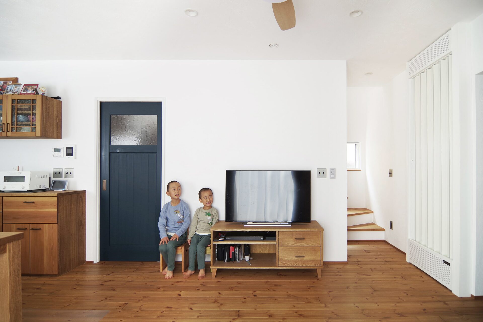 LDKはシンプルな箱型です。壁天井には漆喰を使い、床や無垢ストーリーオリジナルの造作家具はすべて無垢材。自然素材の心地よいい空気感に癒されます。無垢の床は気持ちがいいねー^^
