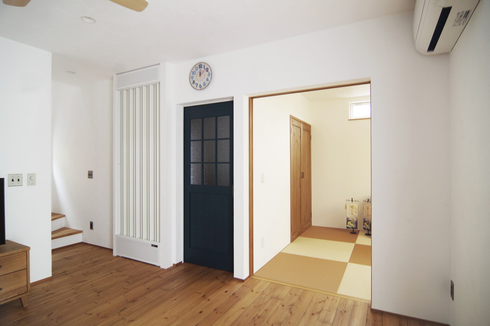 LDKの横には和室を設けヘリなしの琉球畳を市松模敷にしました。また、エアコン一台で家全体が温まる、輻射式冷暖房パネルを設置。輻射熱で暖めるから冬は春の陽だまりのようにぽかぽか、夏は鍾乳洞のようにひんやり^^