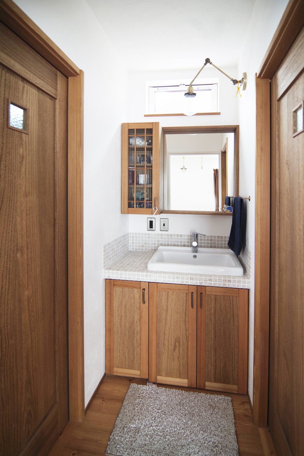 造作の洗面化粧台はベージュのシンプルなタイルと無垢材を組み合わせ、温かみのある印象です。