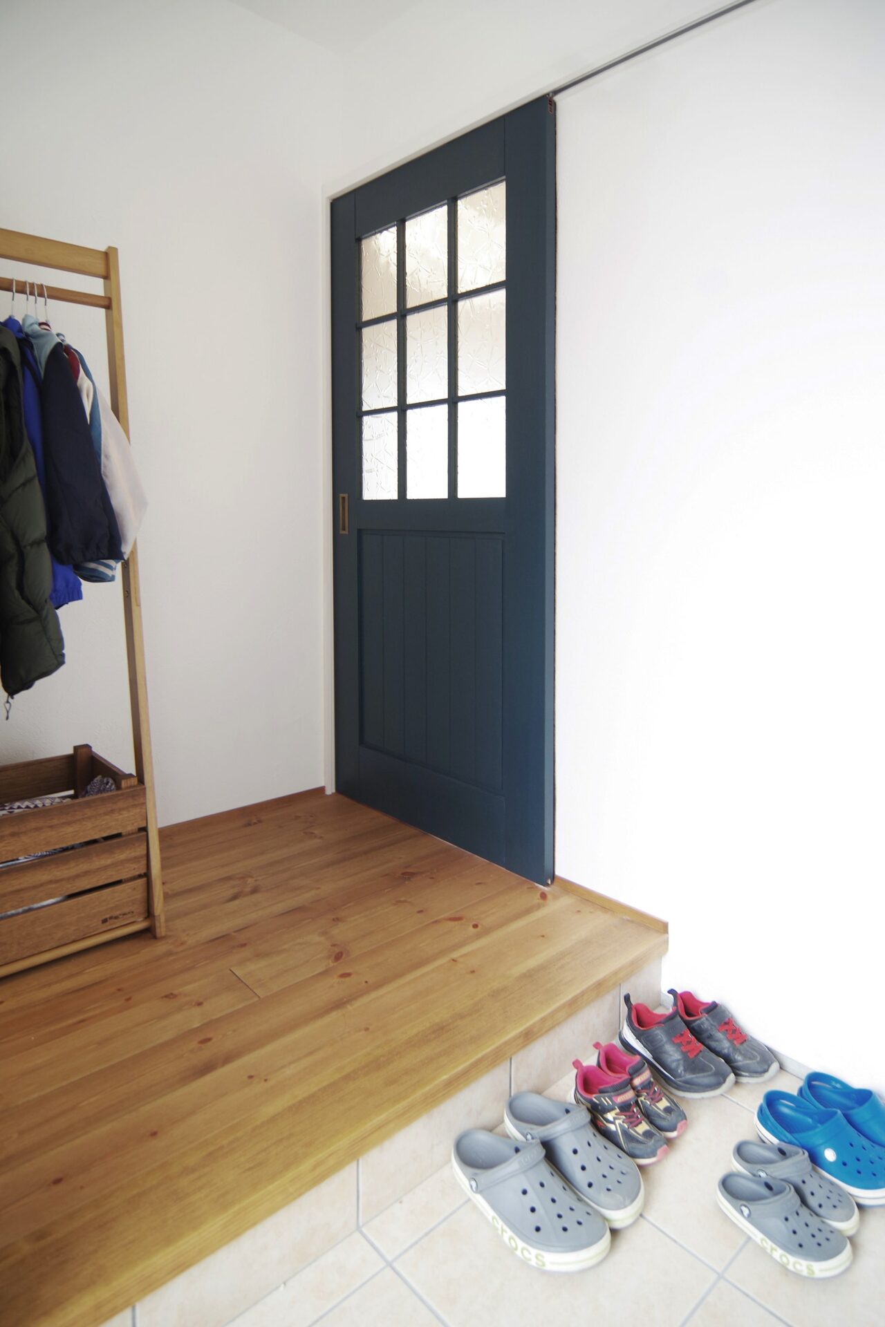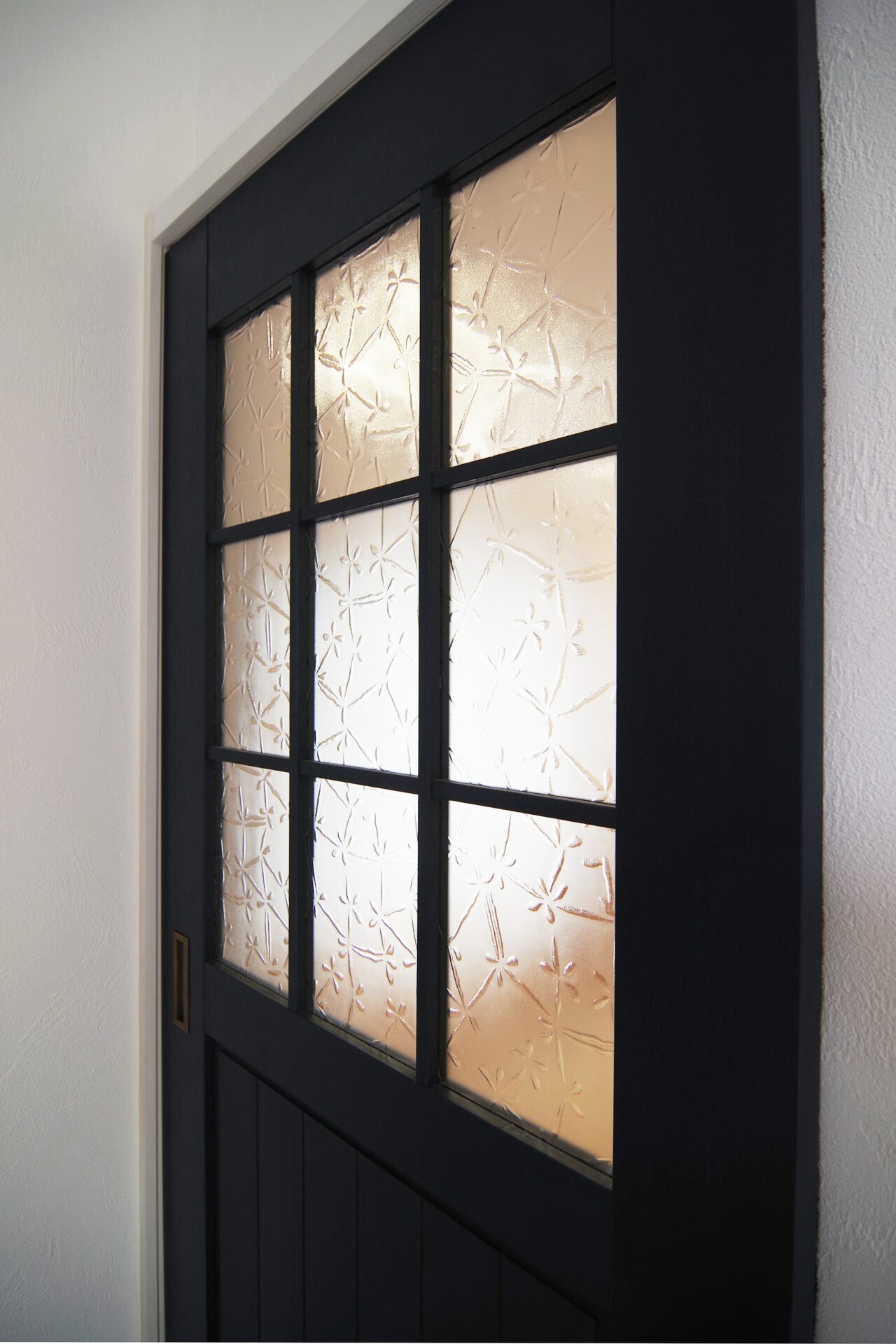 玄関ホールとリビングを仕切るネイビーの建具には、今では作られていない昭和レトロな古いガラスを入れました。
