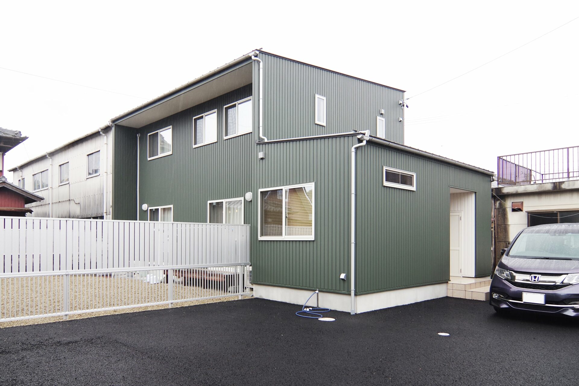 外観はシンプルな箱型のモスグリーンの外壁。軒と袖壁をだして変化を持たせました。