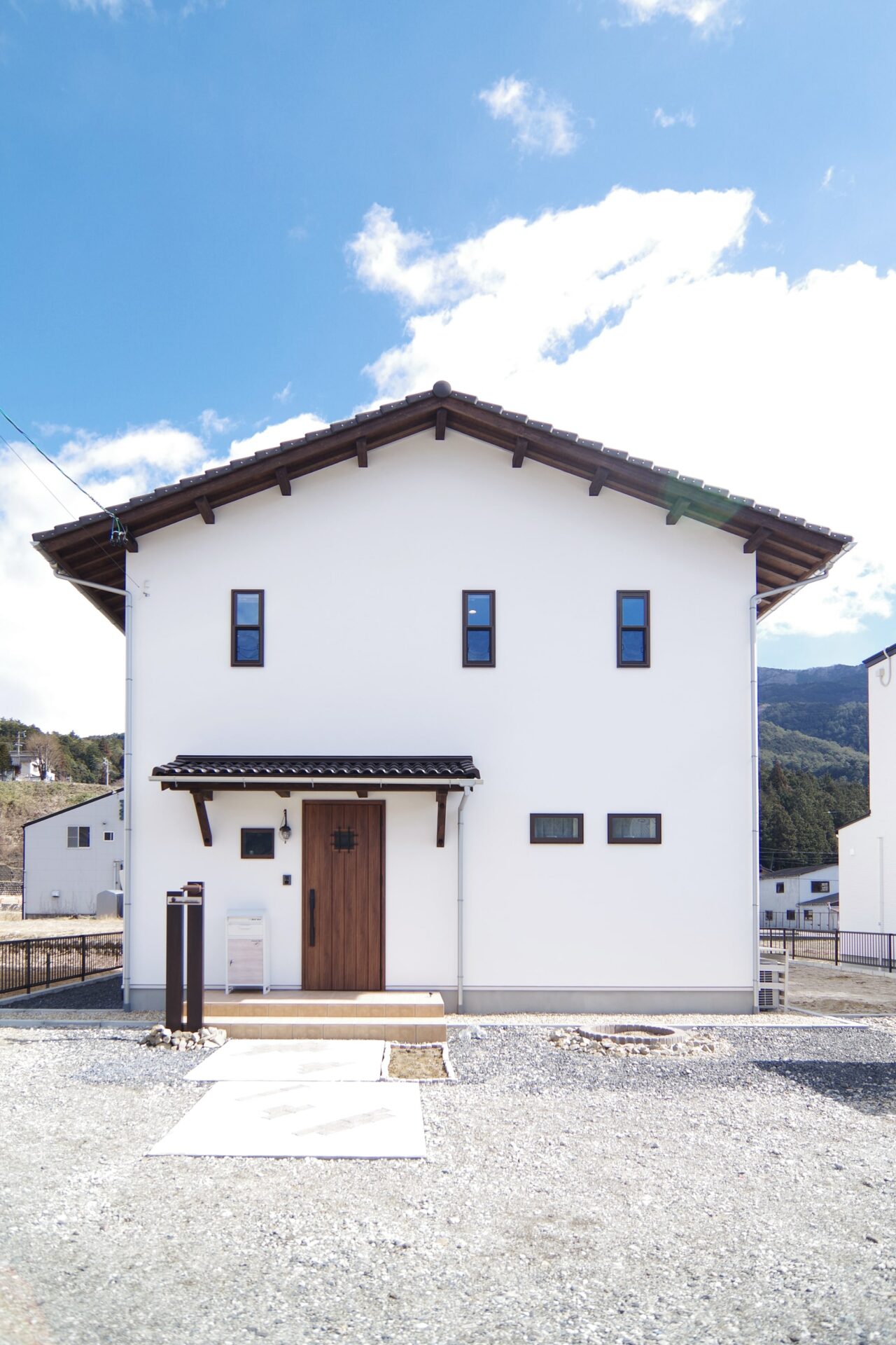 シンプルな切妻屋根と漆喰の白が美しい外壁。ヨーロッパの家を思わせます。