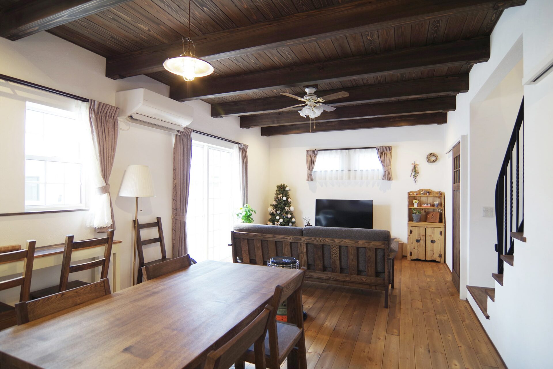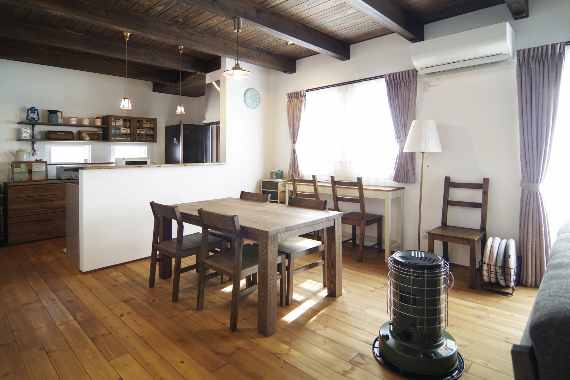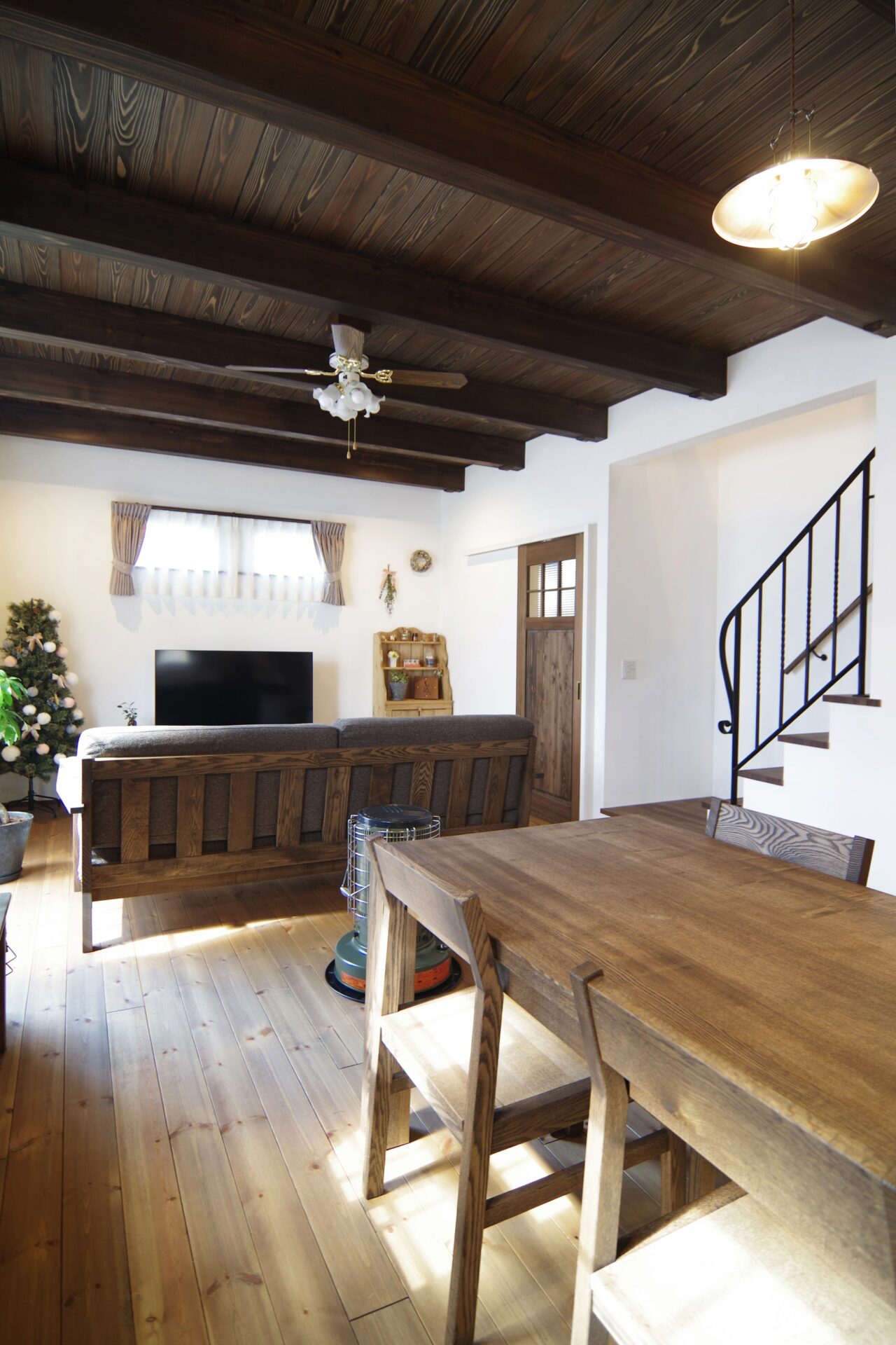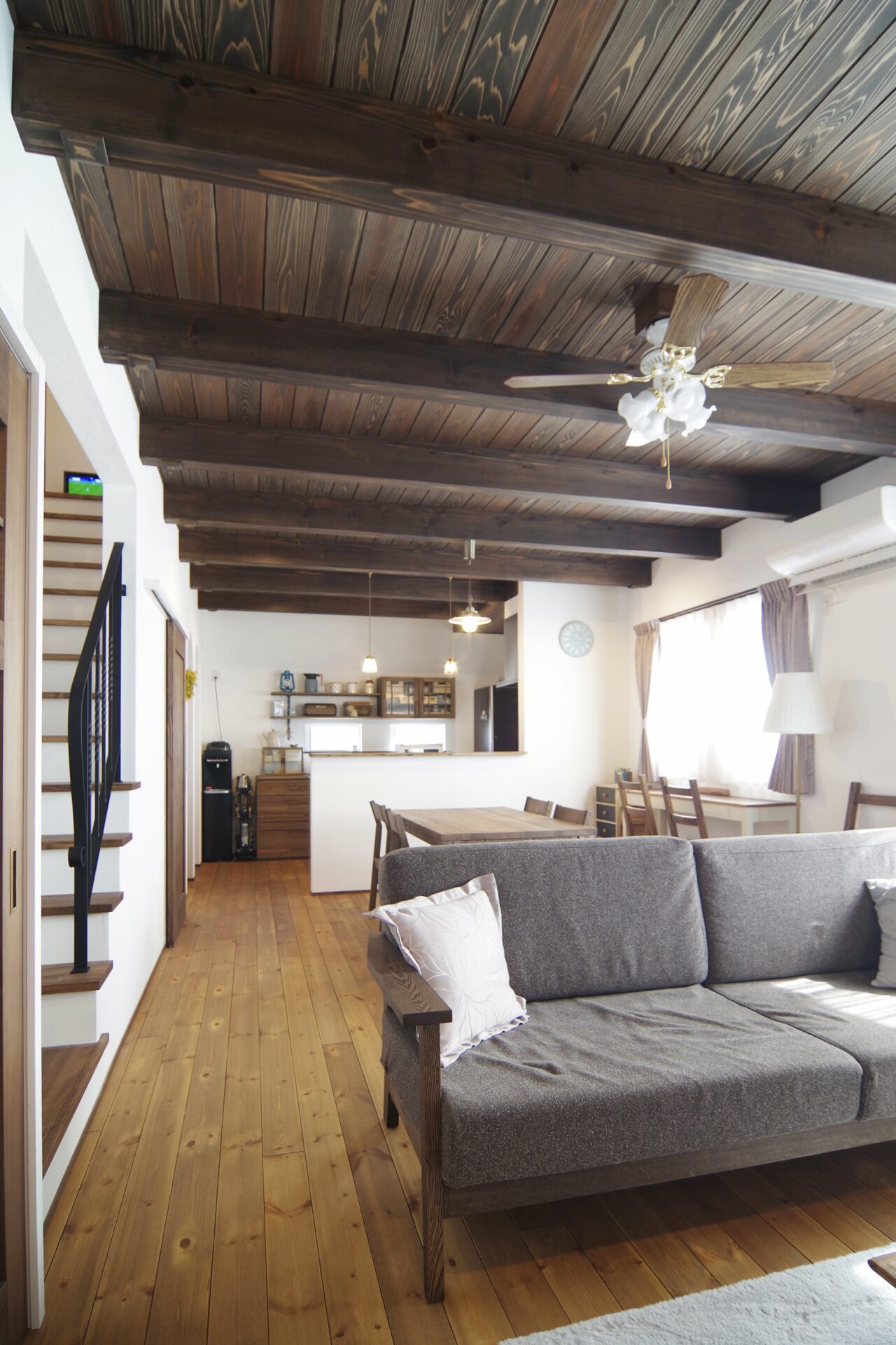 ビターに塗装した杉板の天井が印象的なLDK。壁は漆喰、床はパイン無垢です。