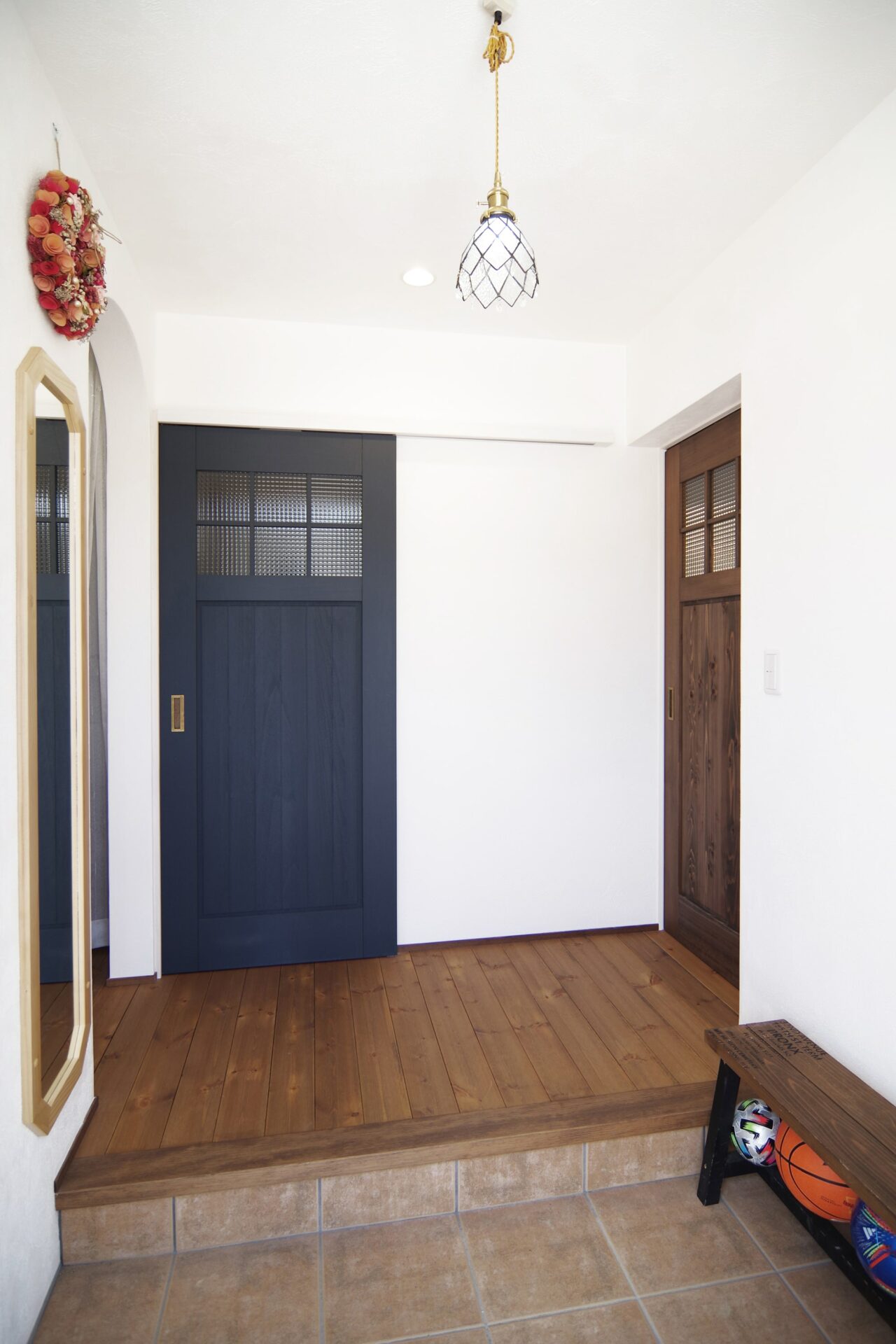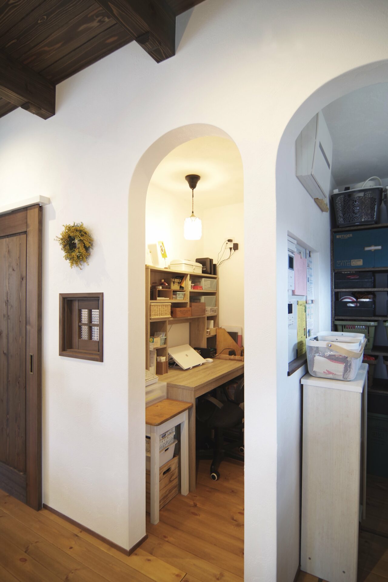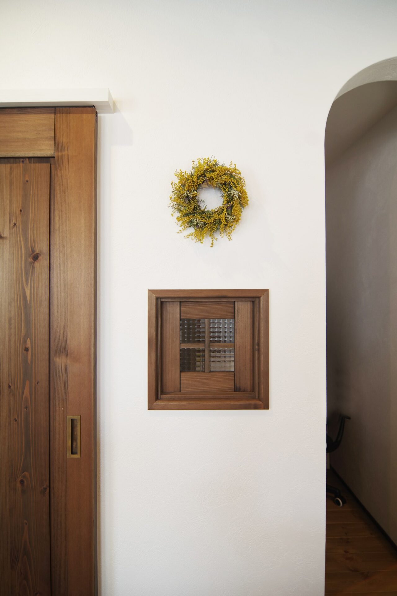 書斎とつながるアンティークな雰囲気の室内窓が素敵です。ミモザのリースはオーナー様の手作りです。