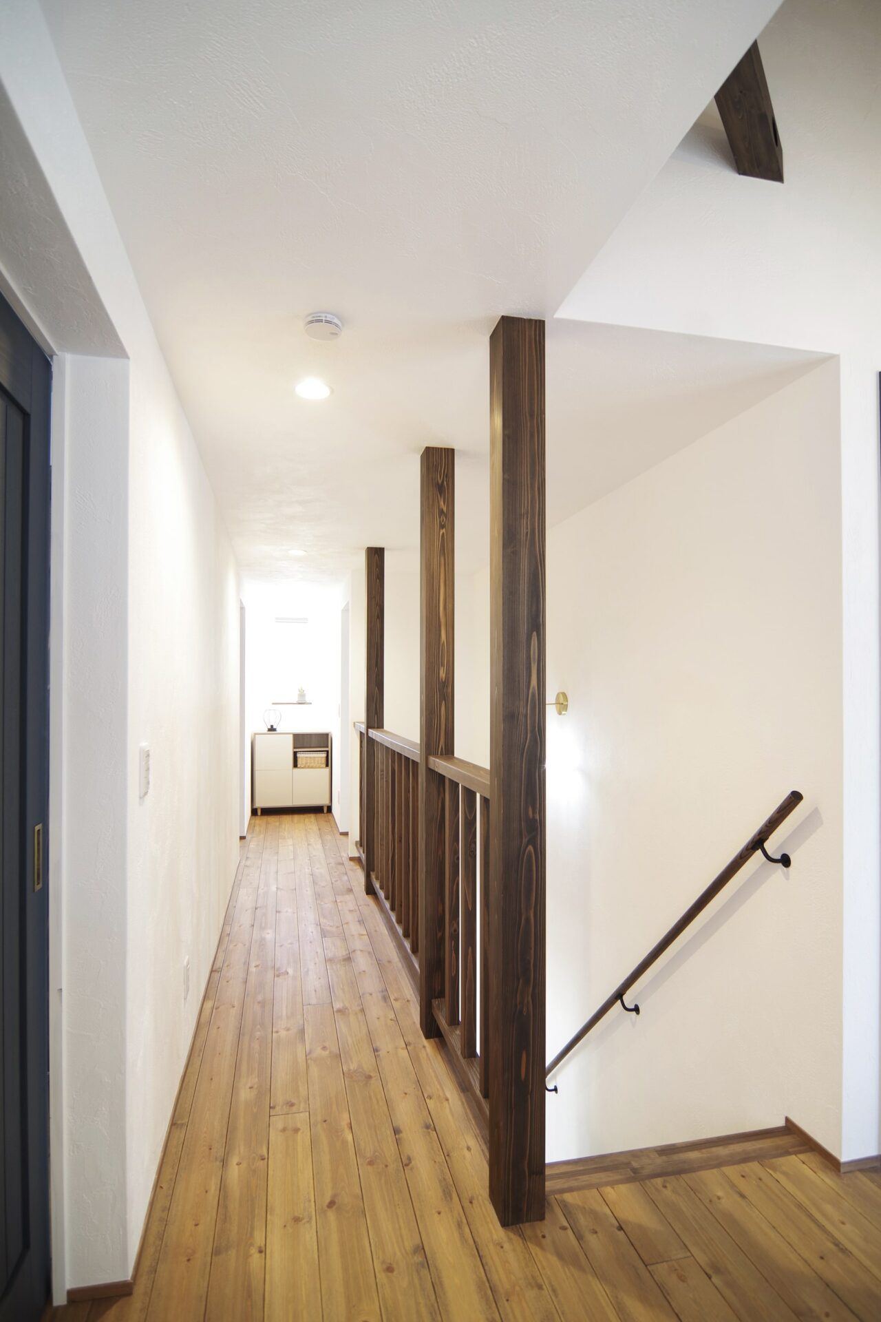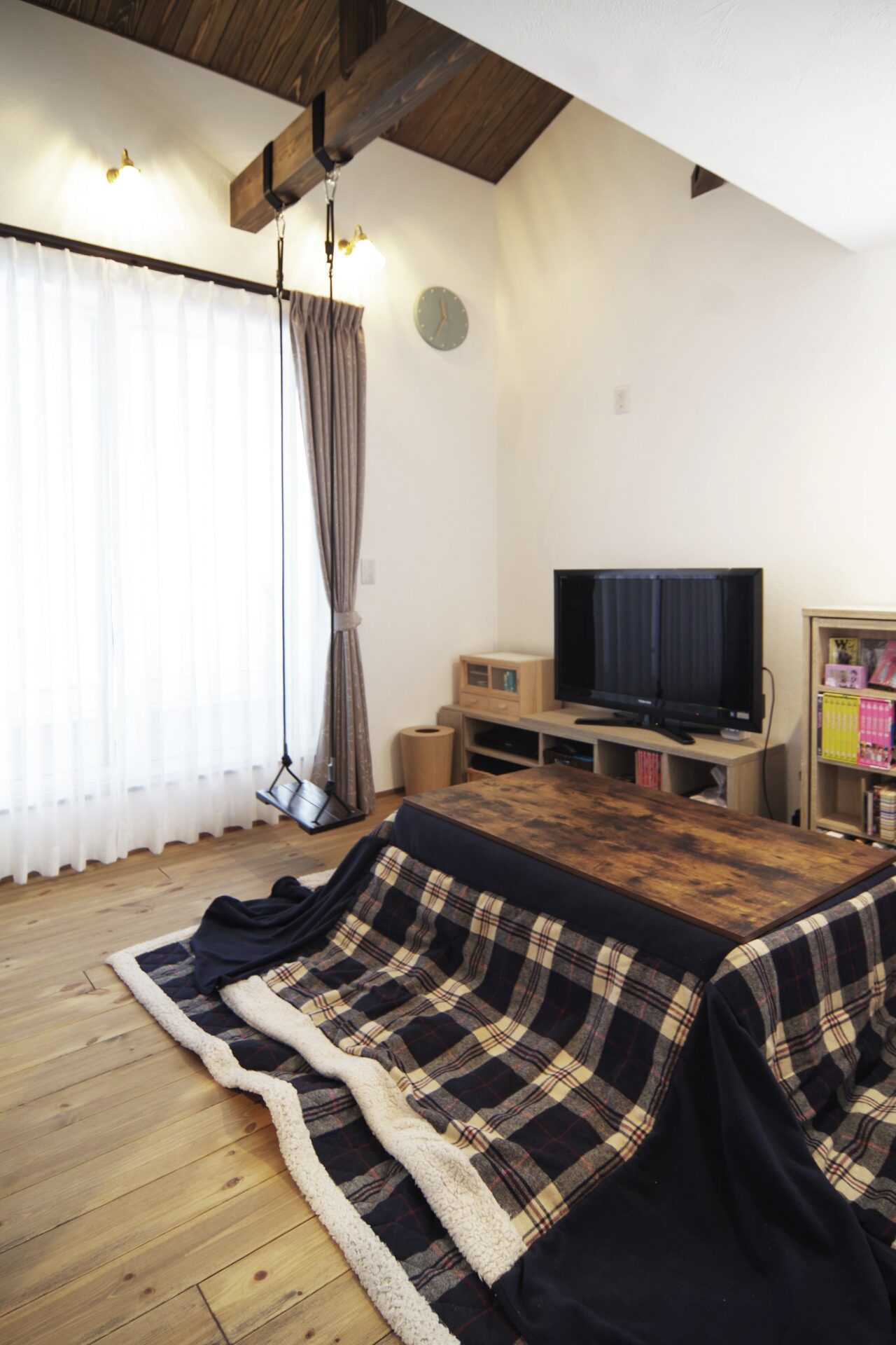 二階ホールのセカンドリビング。コタツをおいて、くつろぎスペースに。