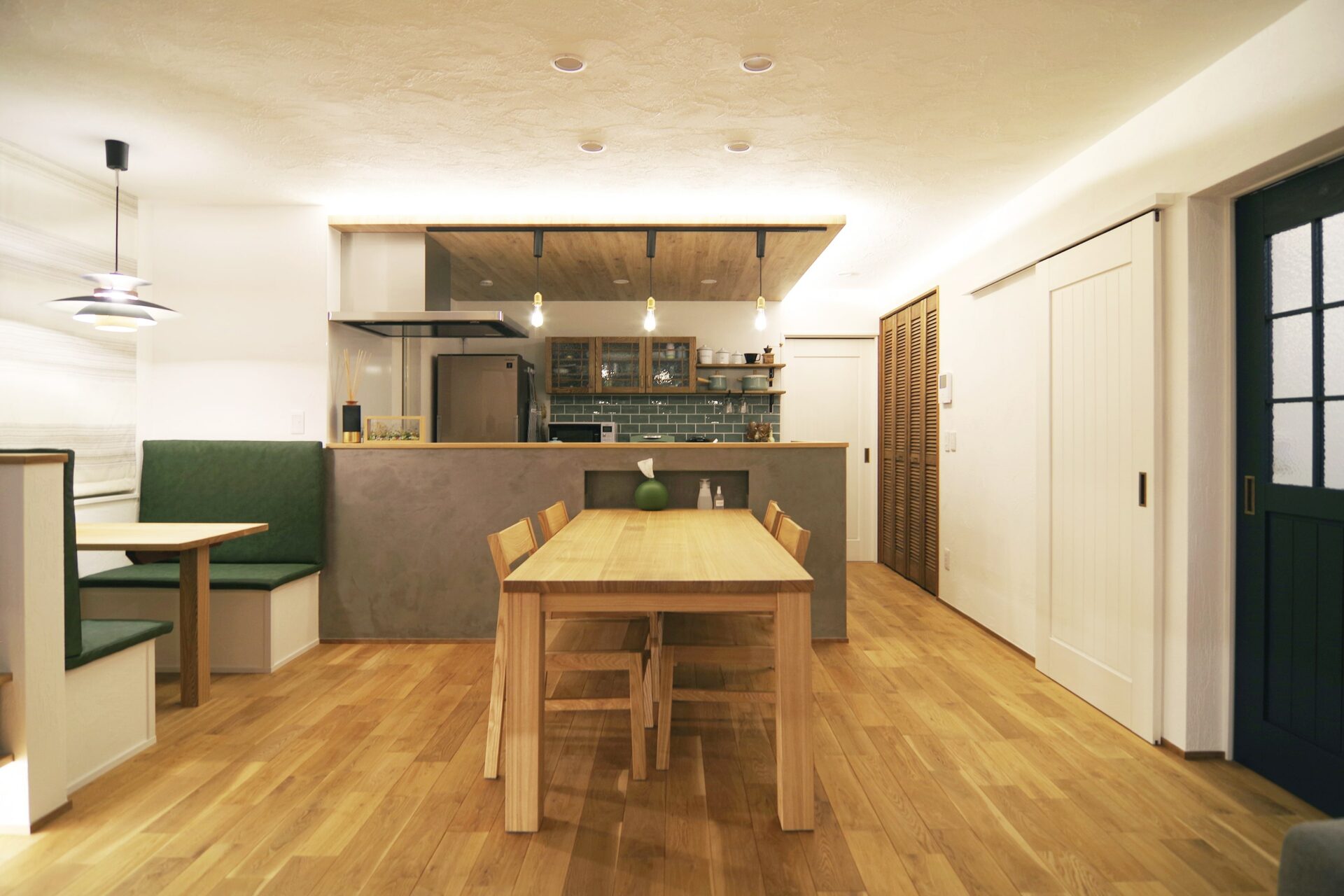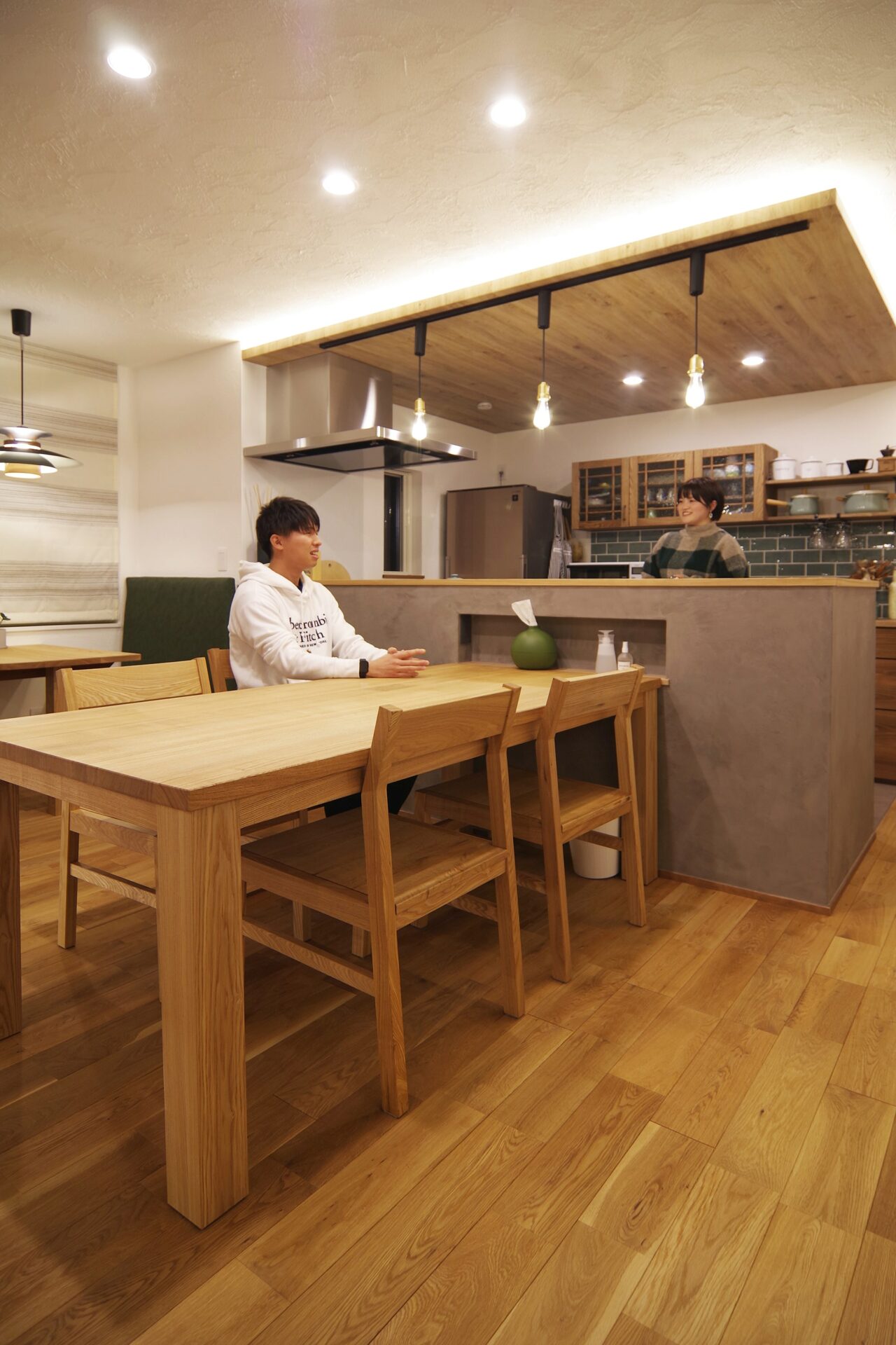 手元が隠れる高さにデザインしたキッチンの腰壁は、モルタル風の素材感があるモールテックスで仕上げ、インダストリアル感をプラスしました。床は無垢のナラ材。ダイニングセットはこの空間に合わせて造作しています。