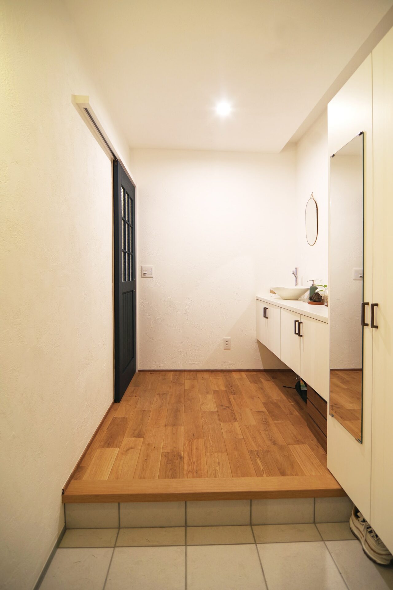 キッチンから洗面コーナー、トイレが直線でつながる動線。脱衣室、洗面コーナー、ランドリールーム、ファミリークローゼットからLDKへとつながる回遊動線もH様のお気に入りとのこと。