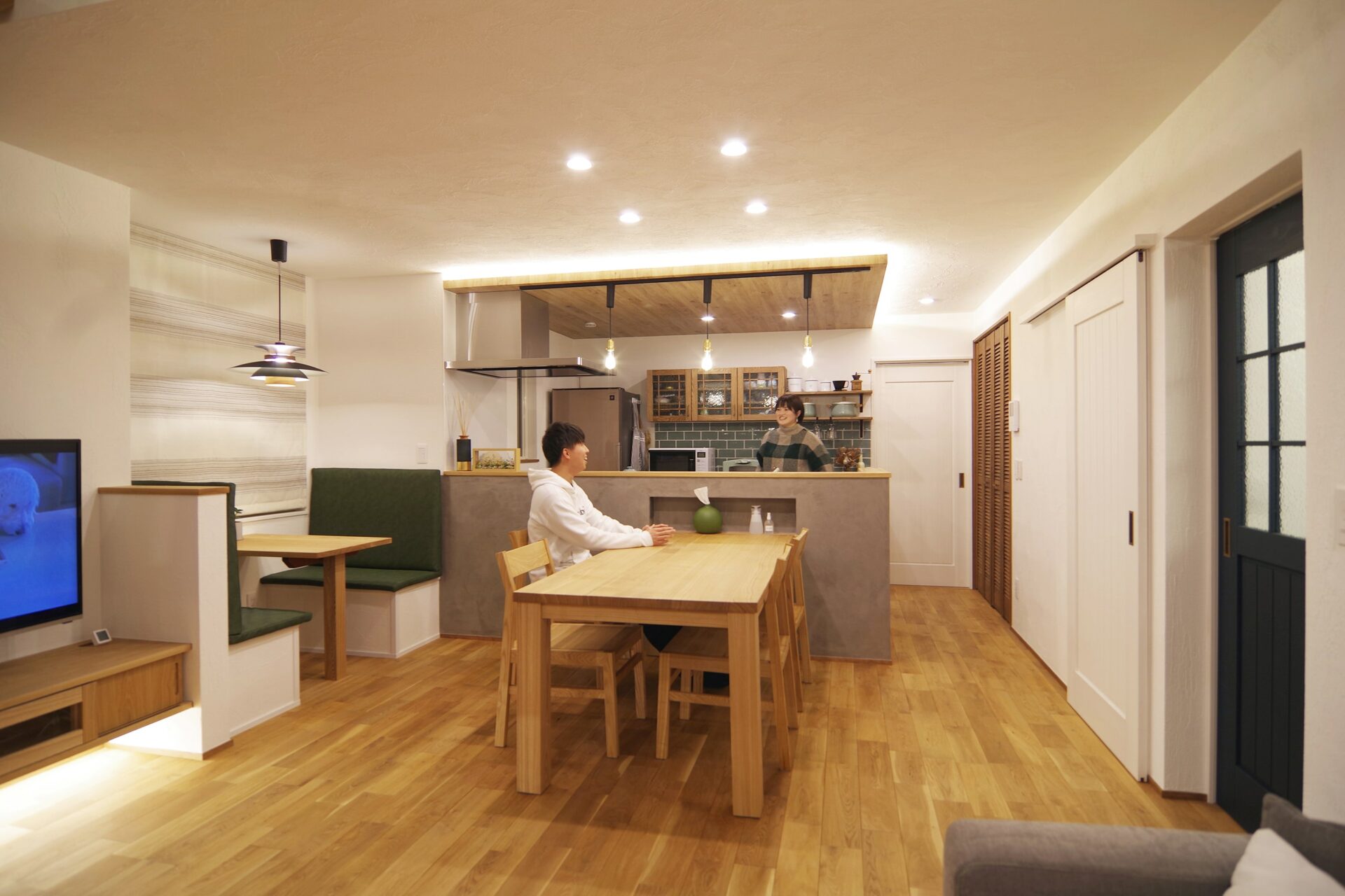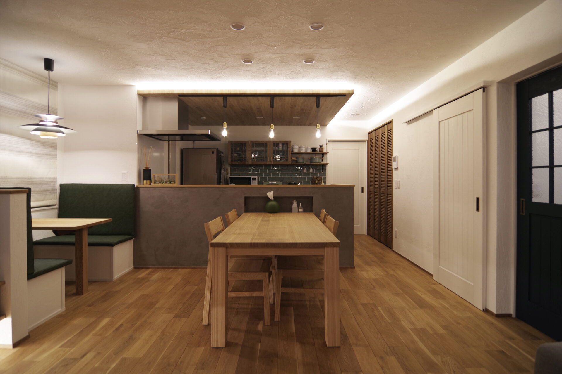 夜になったらダウンライトを消し、間接照明とペンダントライトだけの灯りにすると、こんなシックな雰囲気になります。お酒を飲みながらゆっくりと語り合う、そんな風に過ごす時間にぴったりな演出です。
