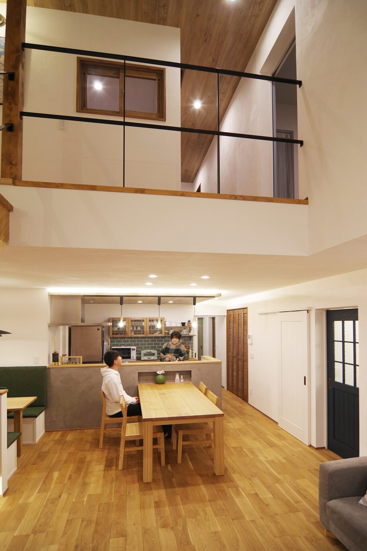 開放感たっぷりの吹抜リビングですが、無垢ストーリーの家は断熱性の高い【低炭素住宅】なため、冷暖房効率もよく省エネな暮らしも叶います。吹抜から見えるアイアン手すりのデザインもこだわりました。