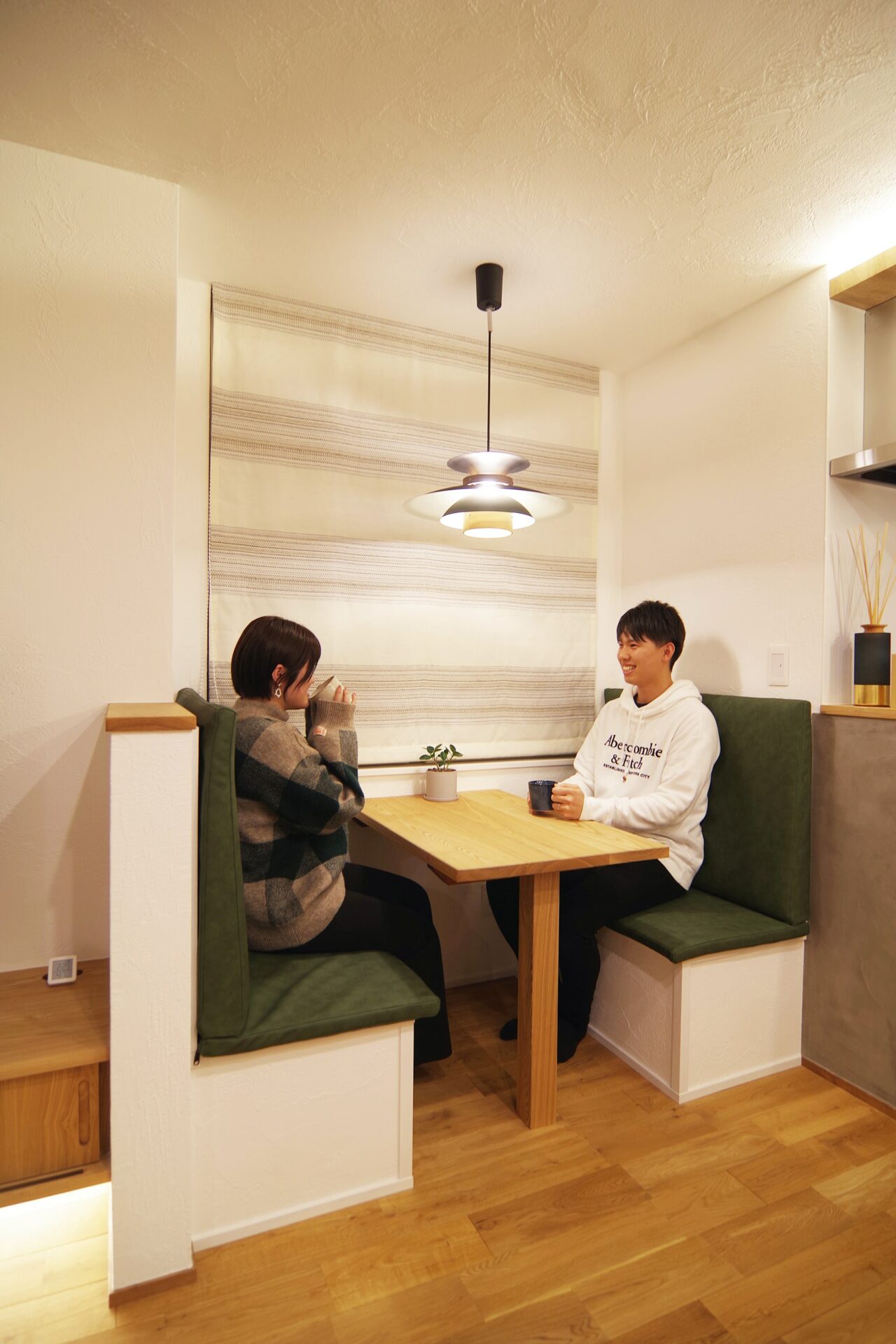 会話が弾みそうなベンチシートのヌック。ベンチもテーブルも無垢Storyで造作しています。北欧デザインのペンダントライトもこのスペースによく似合っています。