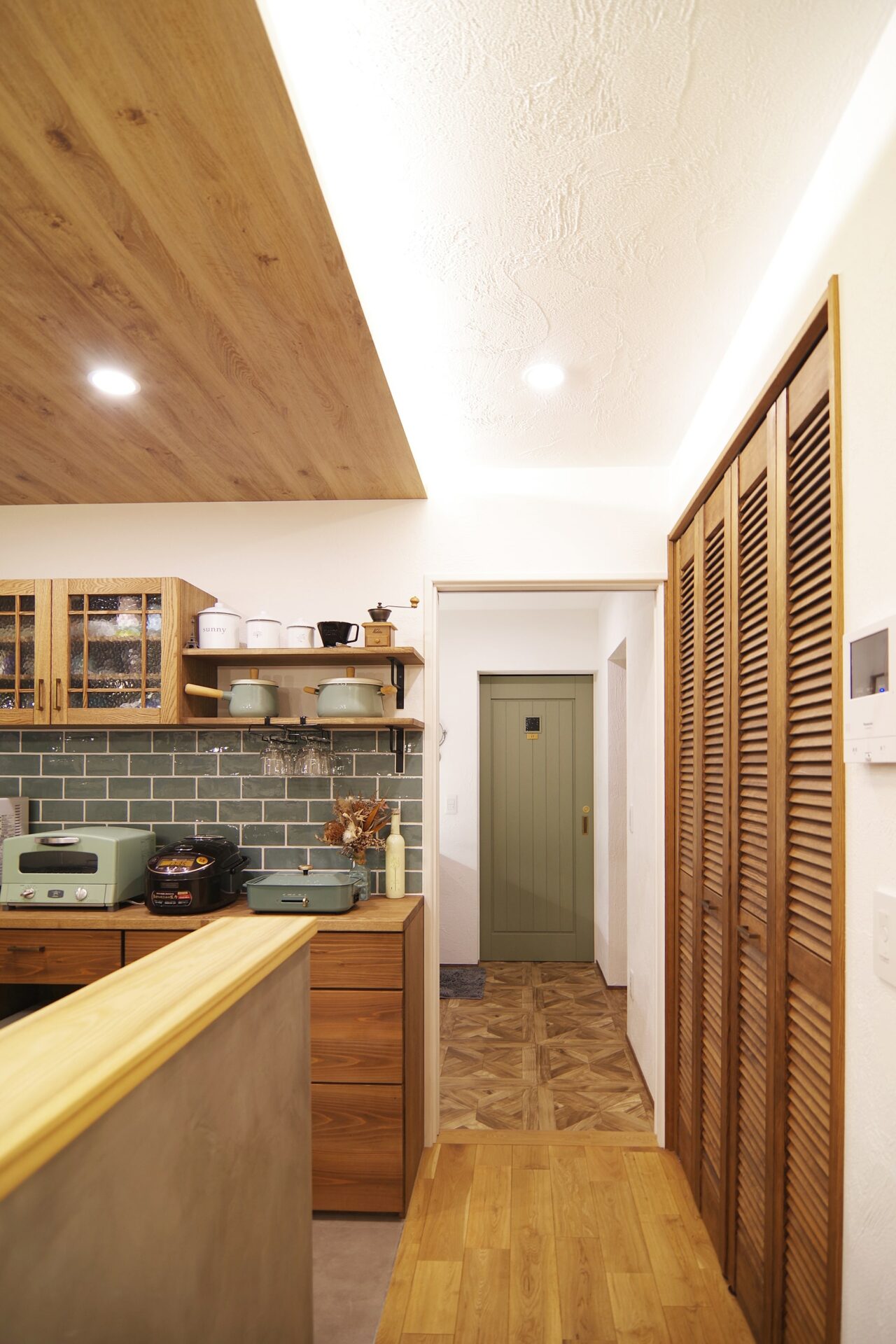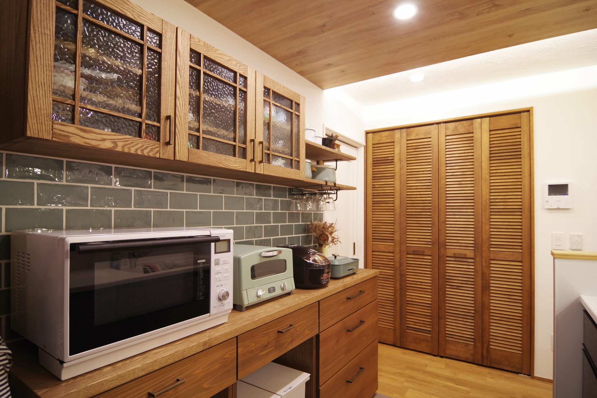 H様が好きなモスグリーンのタイルがキッチンのアクセント。H様の使いやすいようにデザインしたカップボードも無垢で造作しています。ルーバー扉を開けるとパントリーになっています。
