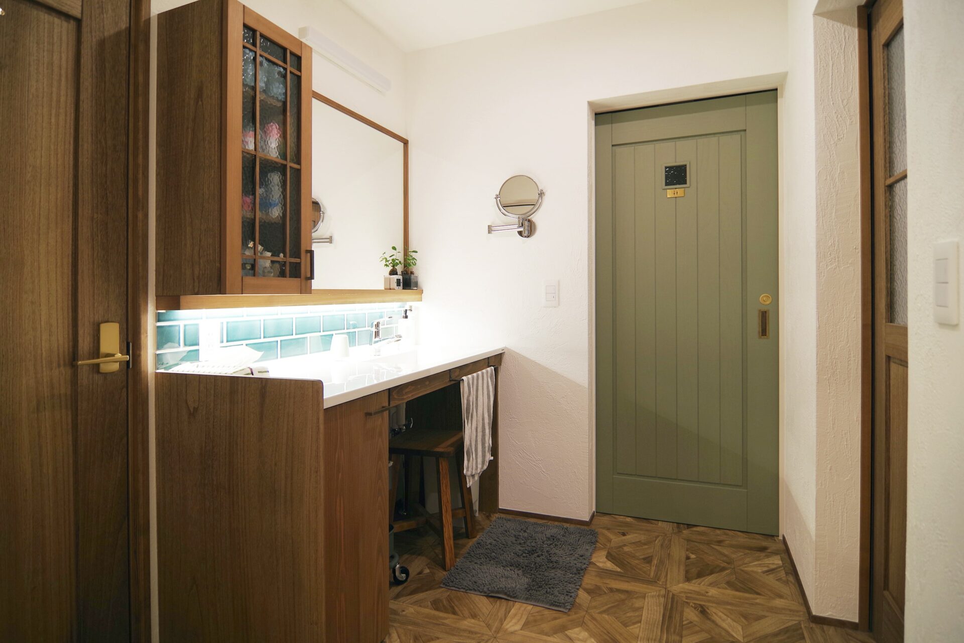 洗面コーナーは脱衣室と別空間に。造作の洗面台はミラー下に間接照明を入れたことでホテルライクな雰囲気も醸し出します。座って髪を乾かしたりすることができるように、足元はオープンにしています。