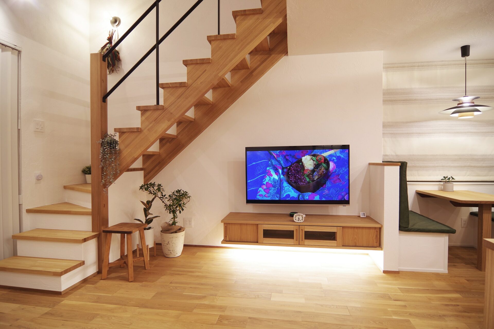 木製のスケルトン階段やフローティングタイプのTVボードなど、デザインにこだわりました。