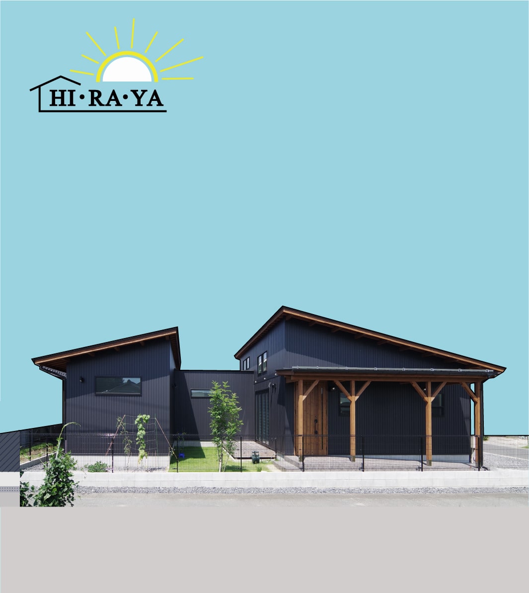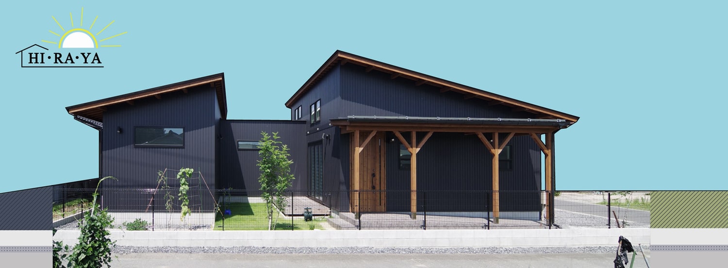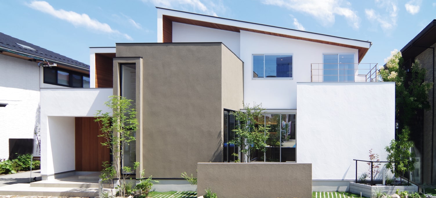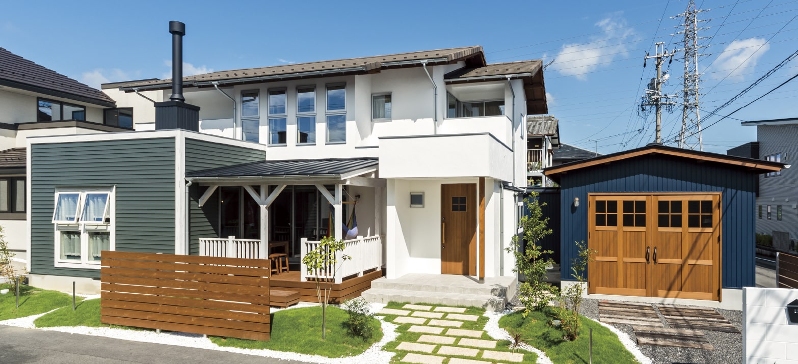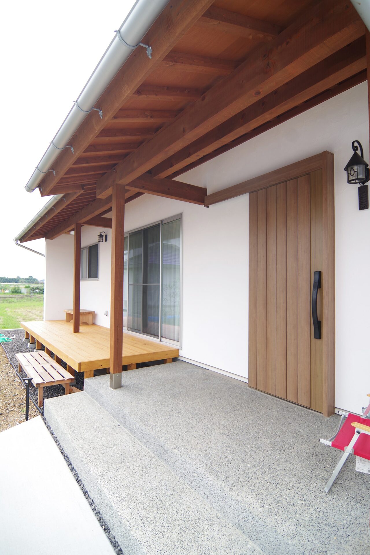 切妻の大屋根が特徴的な和モダンな外観。白のガルバリウムを基調に正面には漆喰を使い、無垢の化粧垂木がアクセントに。自作のウッドデッキが素敵です!