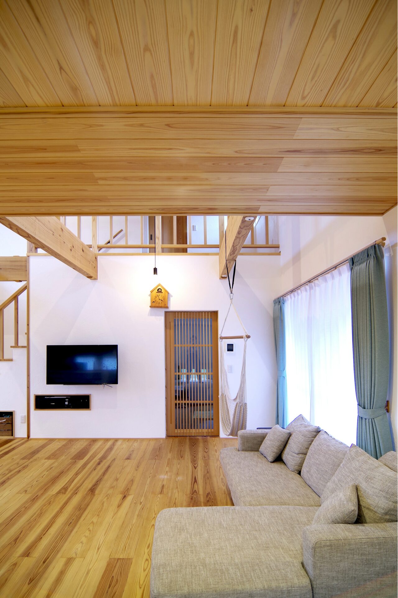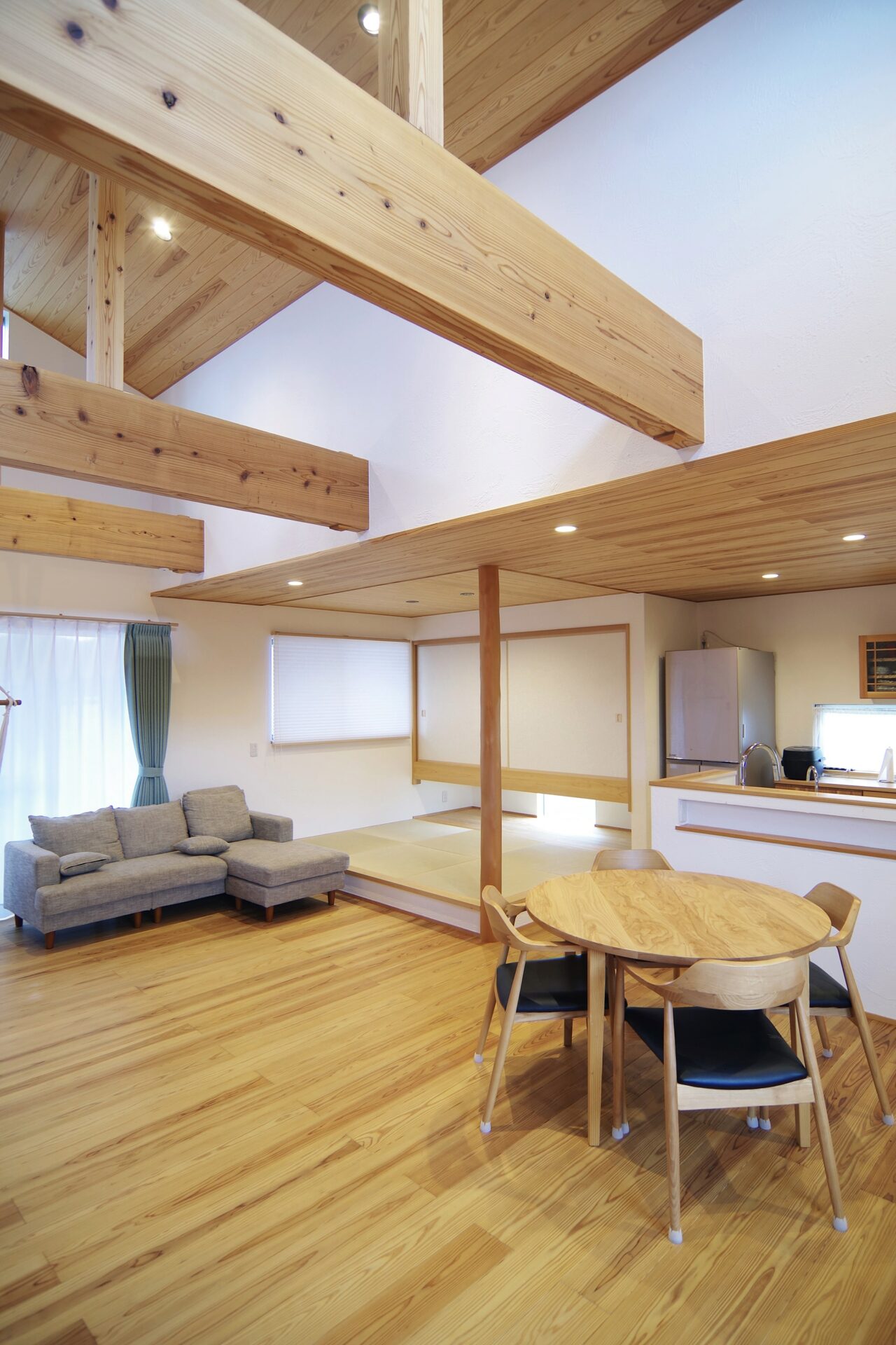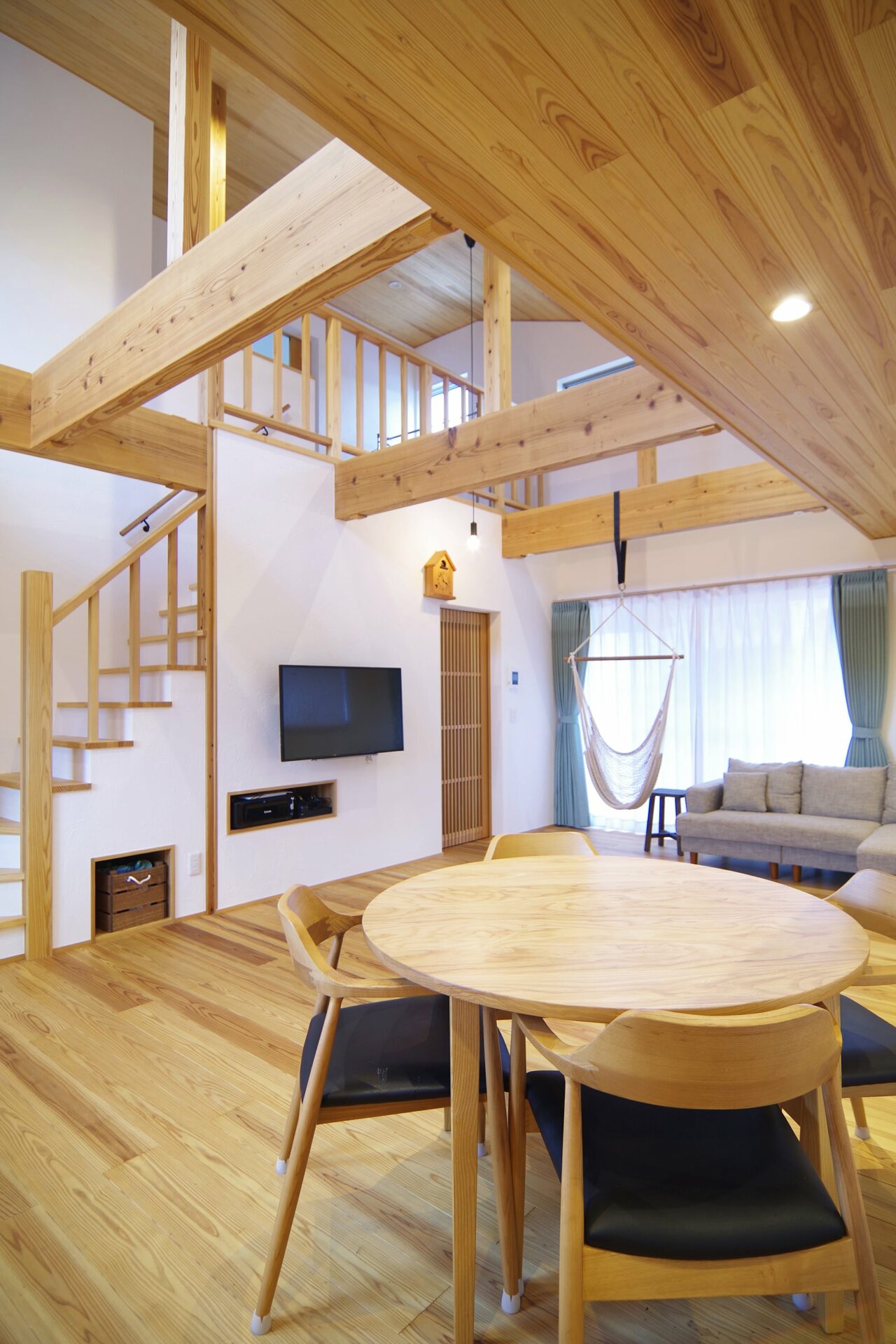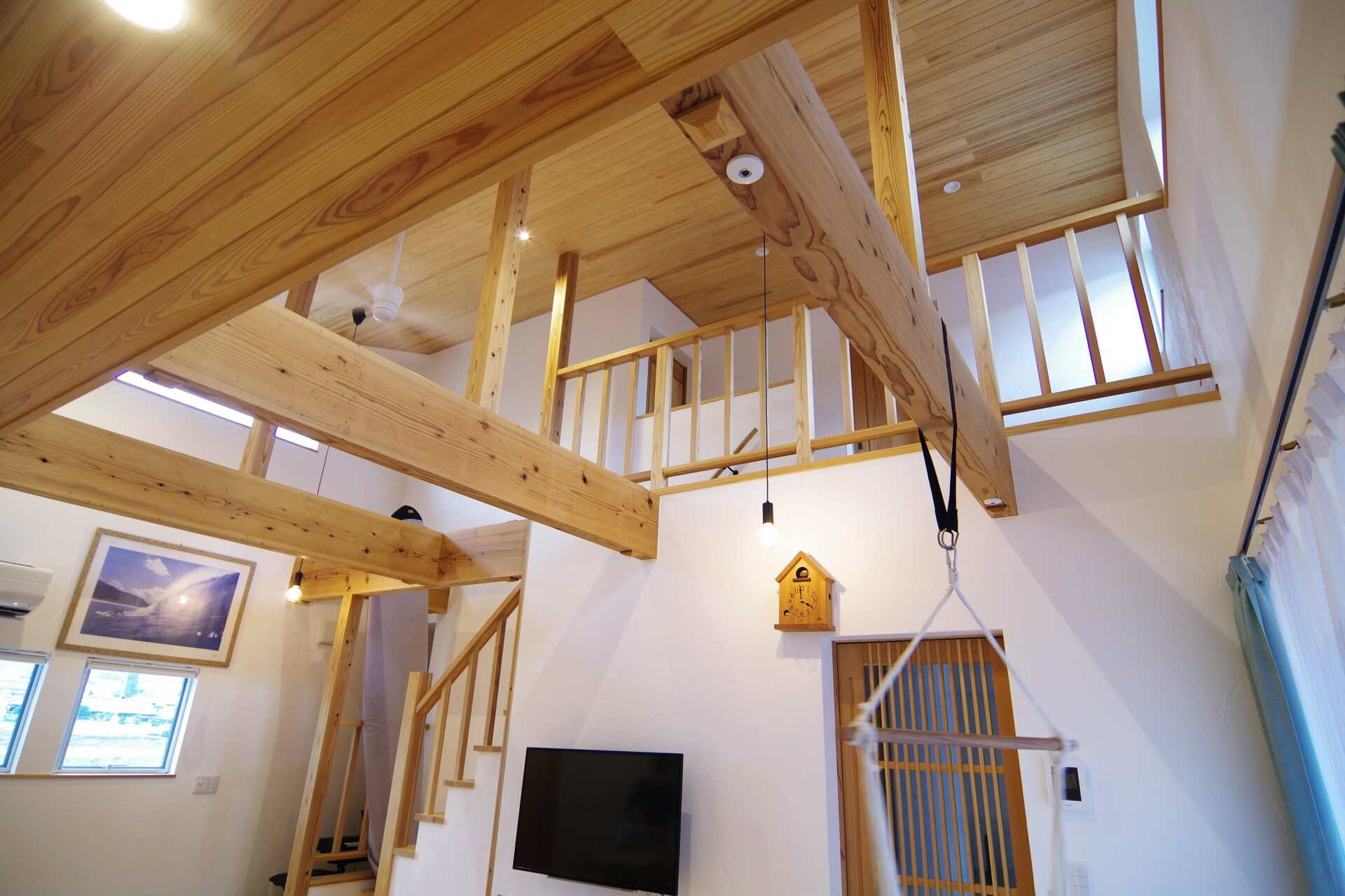迫力のある小屋組みを見せた吹き抜けの内観です!! 天井には杉板を張り、床にも30mmの杉材を使い、塗装も本来の木の色を活かし、あたたかみと柔らかな雰囲気が印象的です。