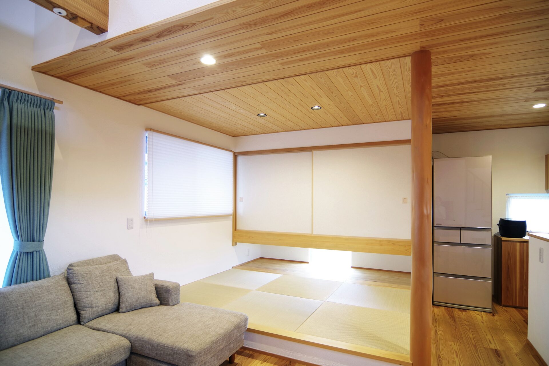 リビングに隣接した畳コーナーは小上がりになっていて、空間にメリハリをつけます。杉の磨き丸太の柱がとても美しいです。