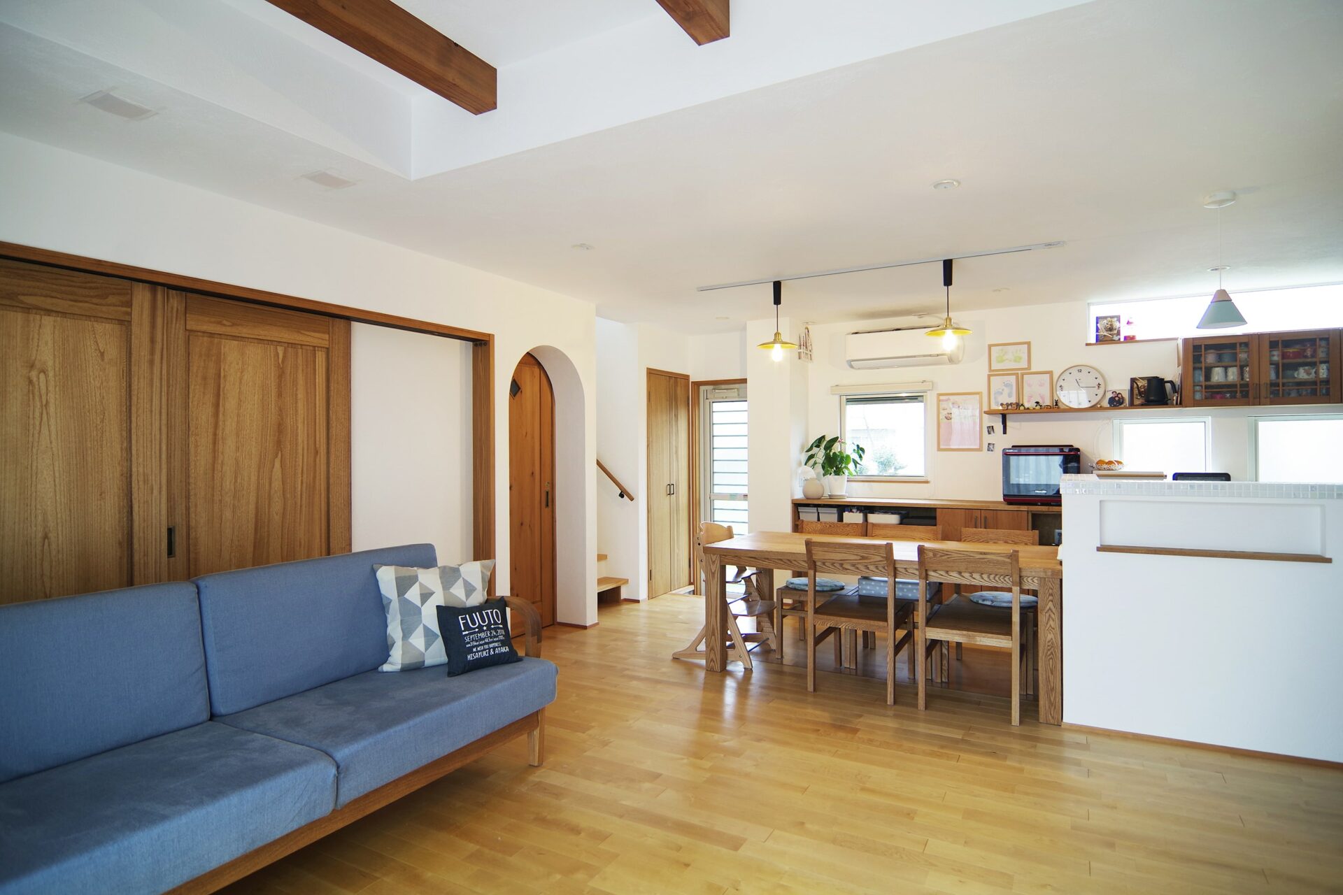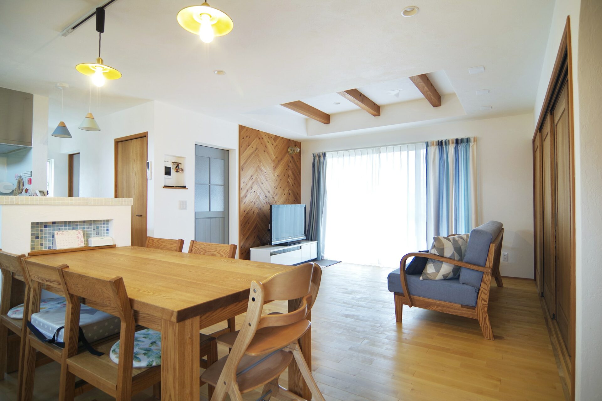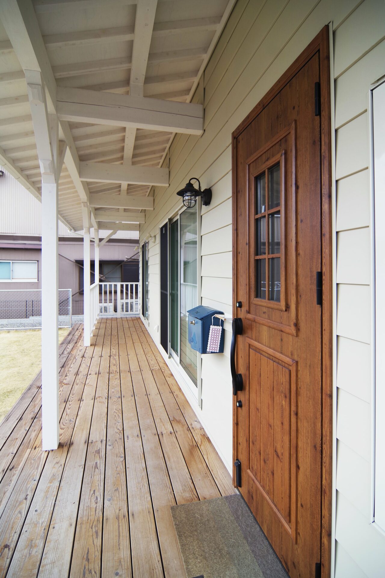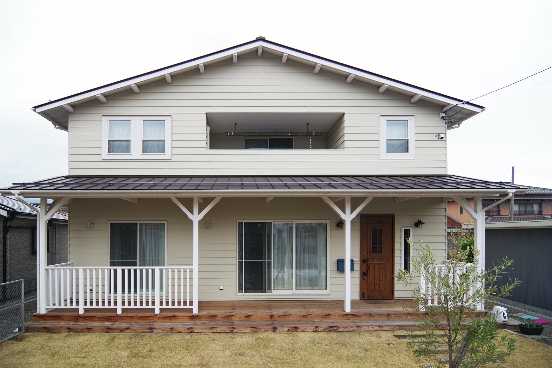 ウッドデッキを南側全面に配置し、ベージュのガルバリウムを横張りにしたサーファーズハウスのような外観。広いウッドデッキはアウトドアにも最適!