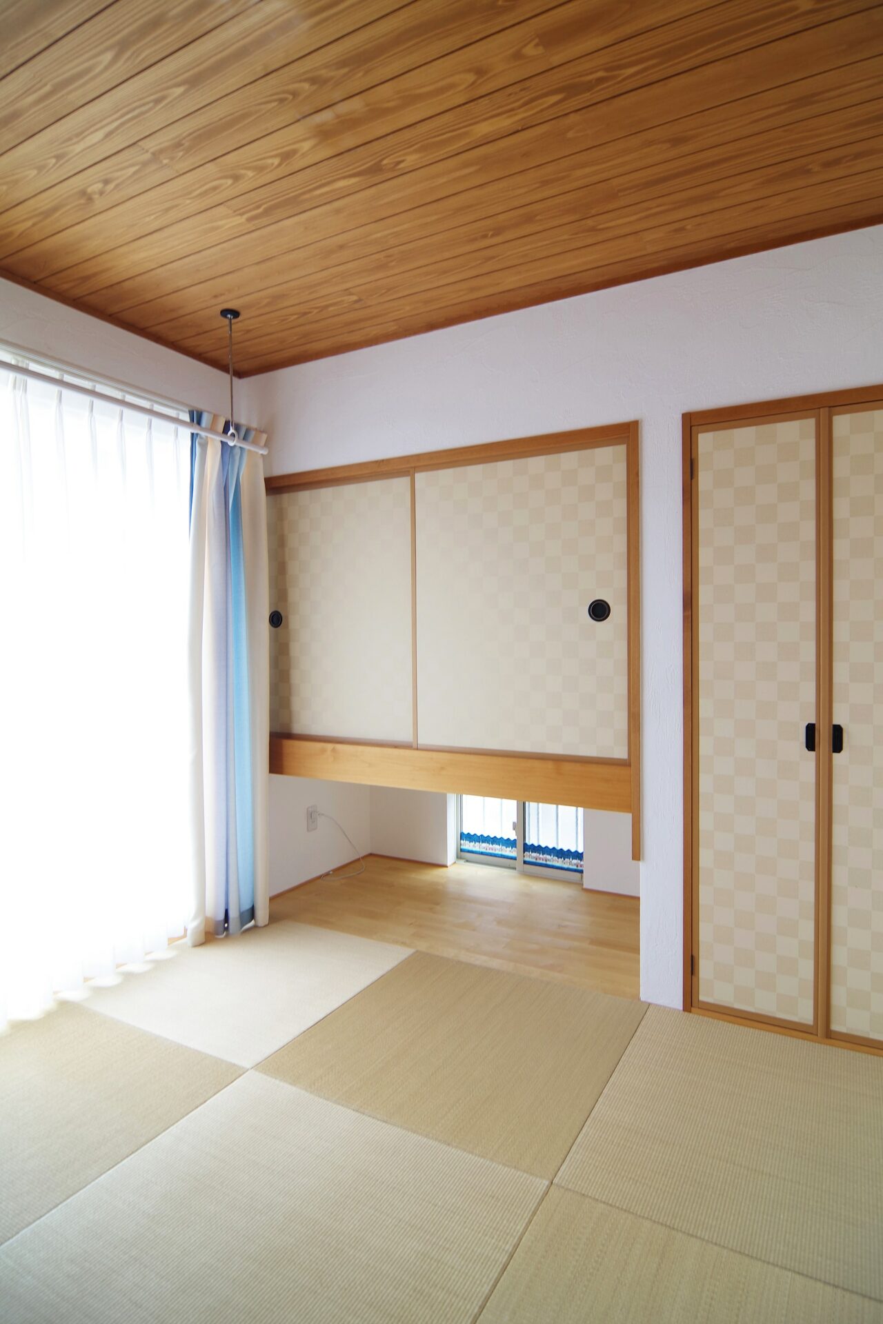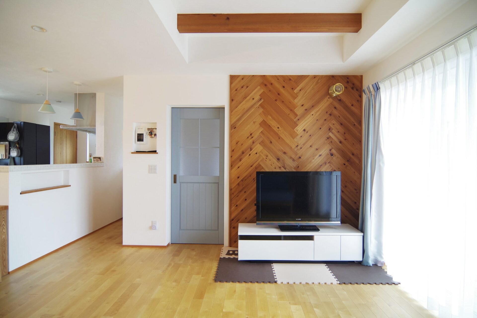ヘリンボーンのアクセントウォール。ミルクペイントで塗装されたアンティークブルーの建具が印象を柔らかくします。