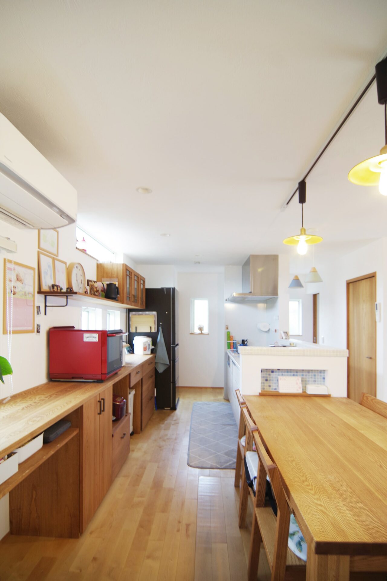 造作のダイニングセットと背面収納。オーダーで大きさや高さを変えることができます。