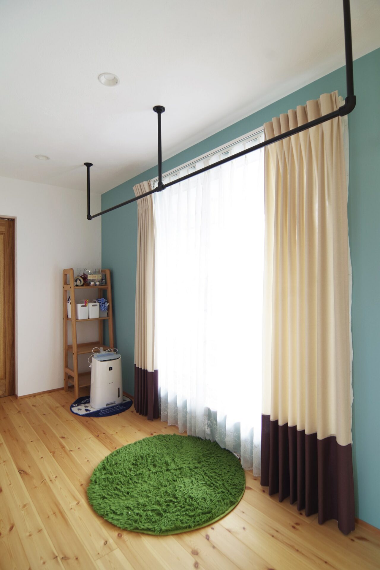 二階ホールに室内物干しスペース。ターコイズブルーのアクセントクロスもおしゃれです。