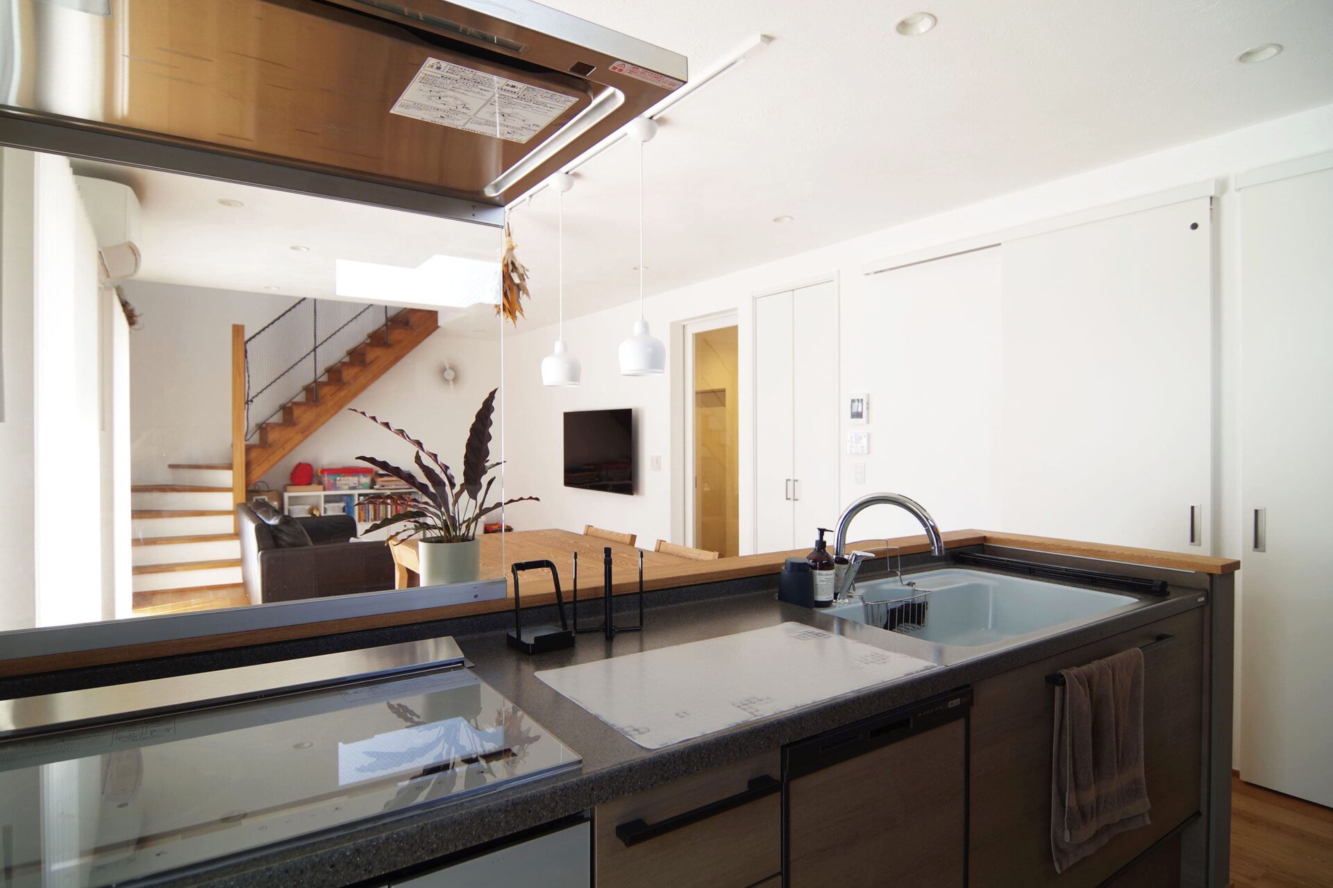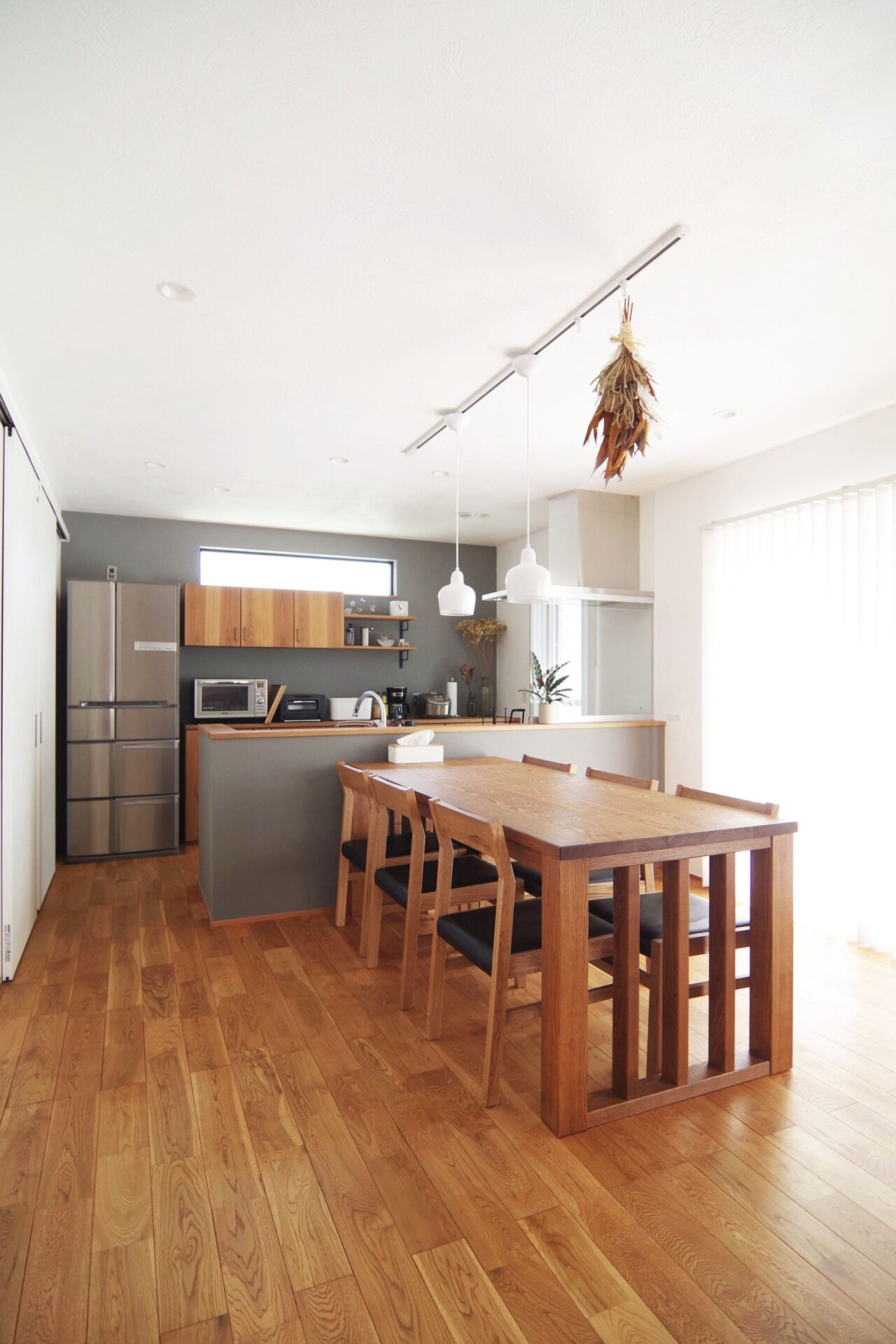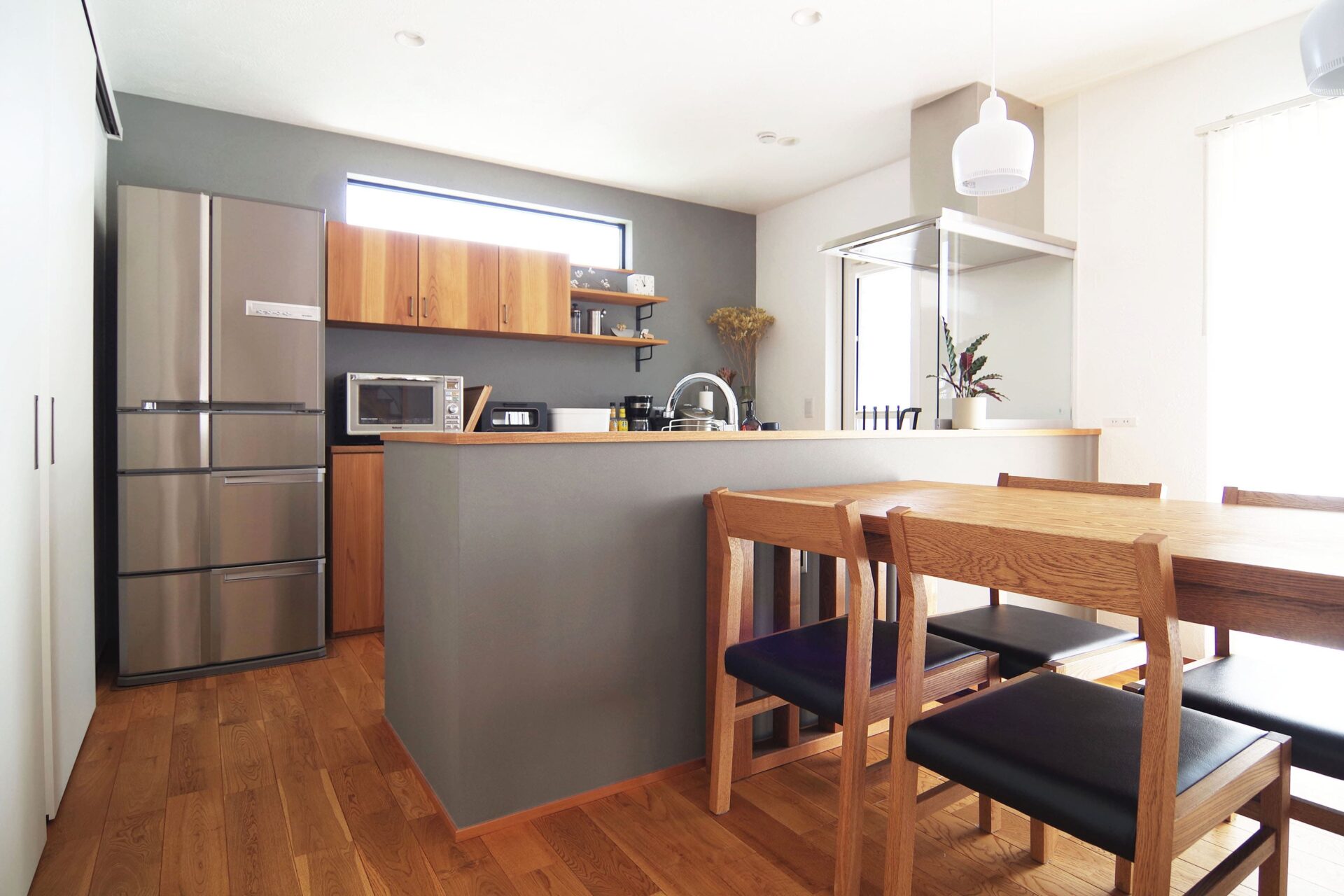 キッチンの背面、カウンターにはグレーのジョリパットを使用。無機質な色合いは無垢材ともよく合い、シンプルでモダンな印象です。