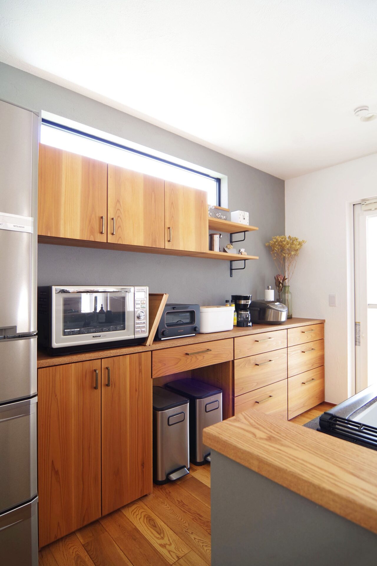 杉材の木目が美しいキッチン背面収納。本社工場で職人が作る、無垢ストーリーオリジナルの造作家具です。