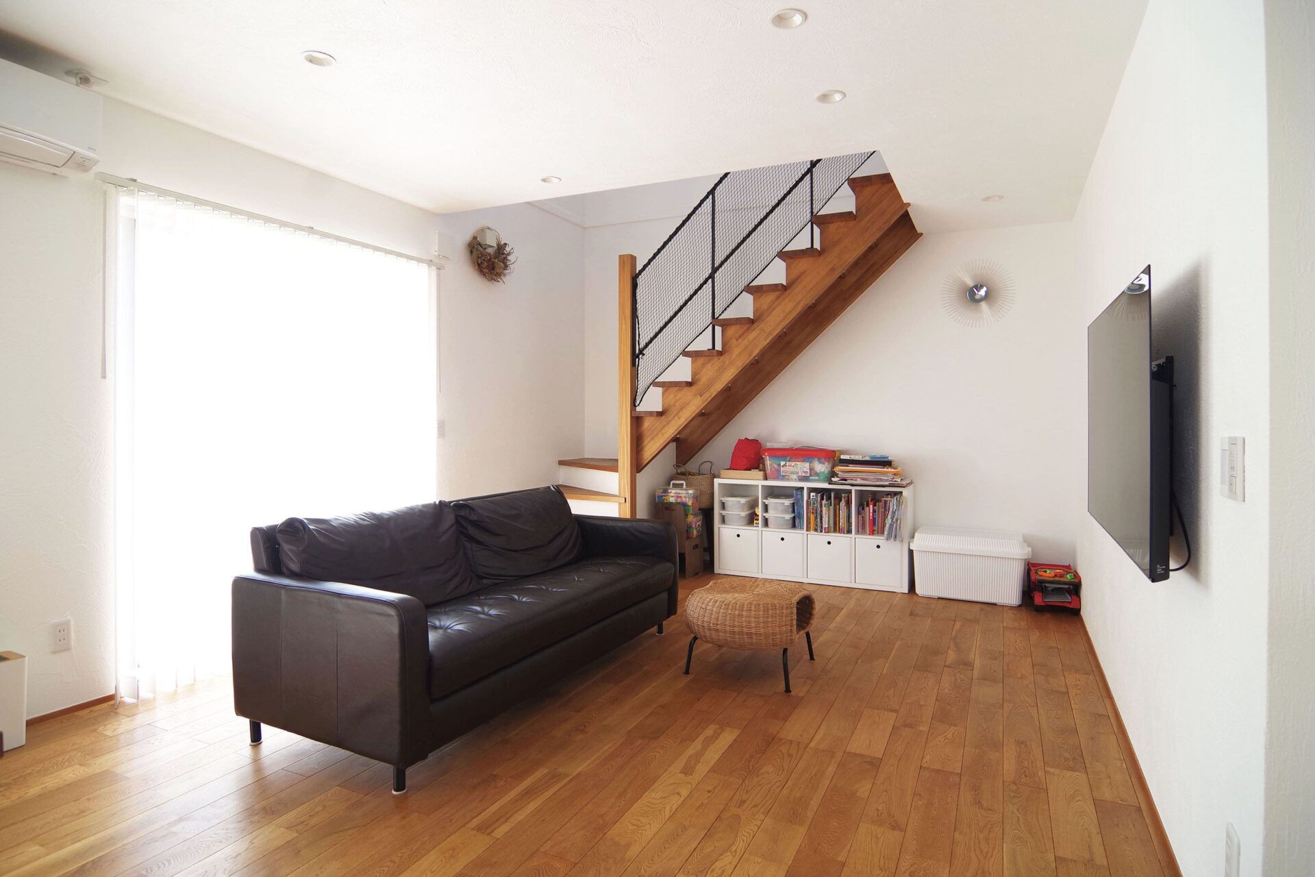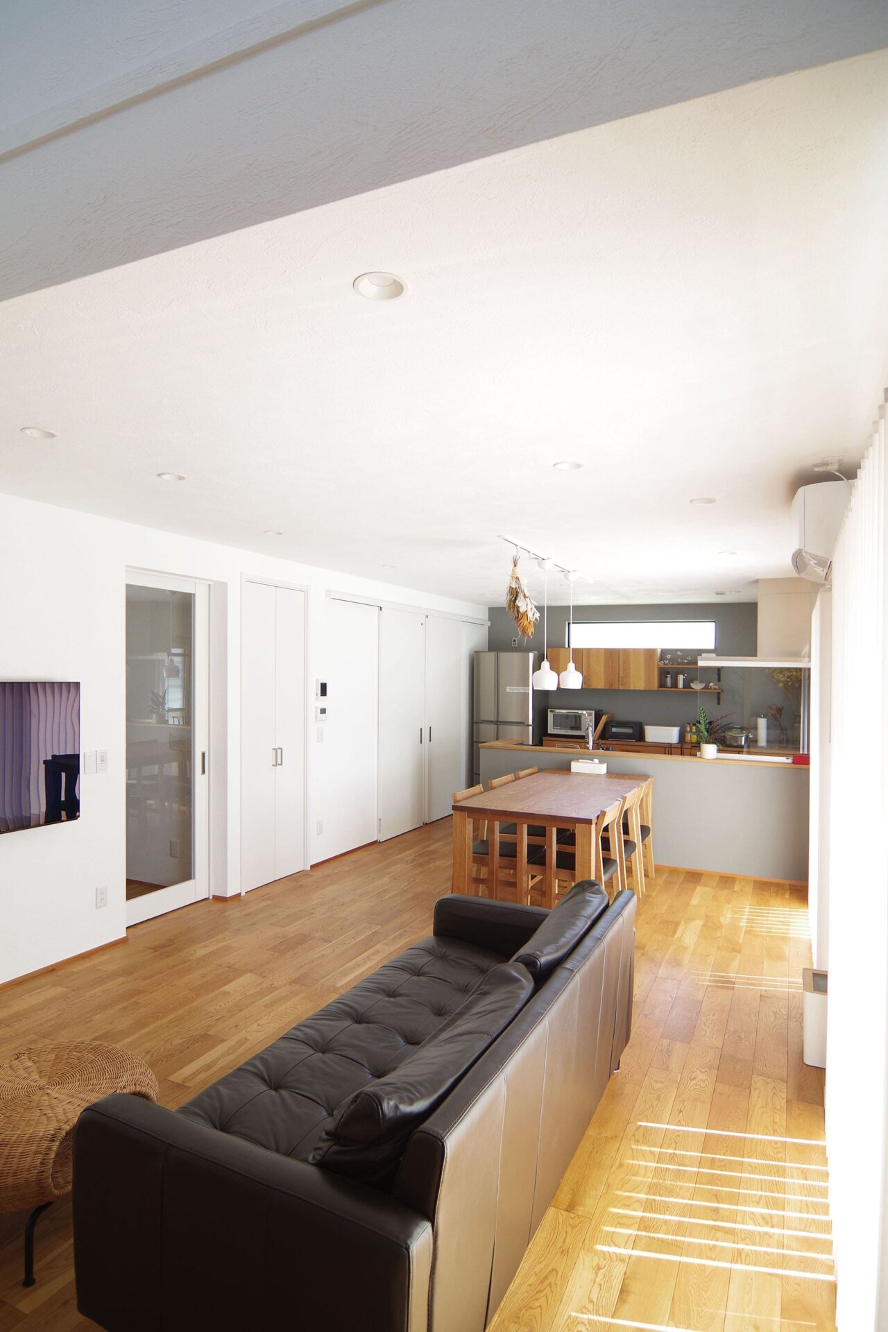 箱型のシンプルなLDK。壁天井はすべて漆喰を使い、床はナラ無垢と自然素材をふんだんに使ったやさしい空間です。