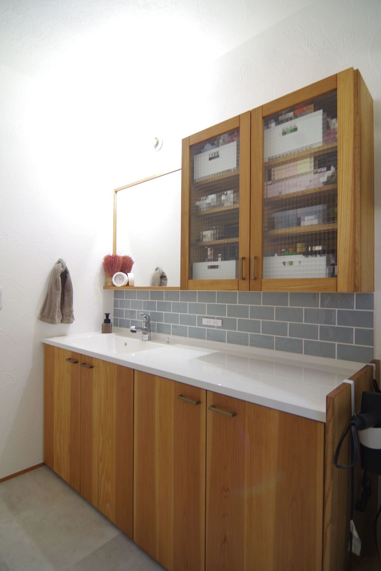 明るく、清潔感のある洗面室。壁面に張られたグレーのタイルがおしゃれな造作の洗面化粧台です。