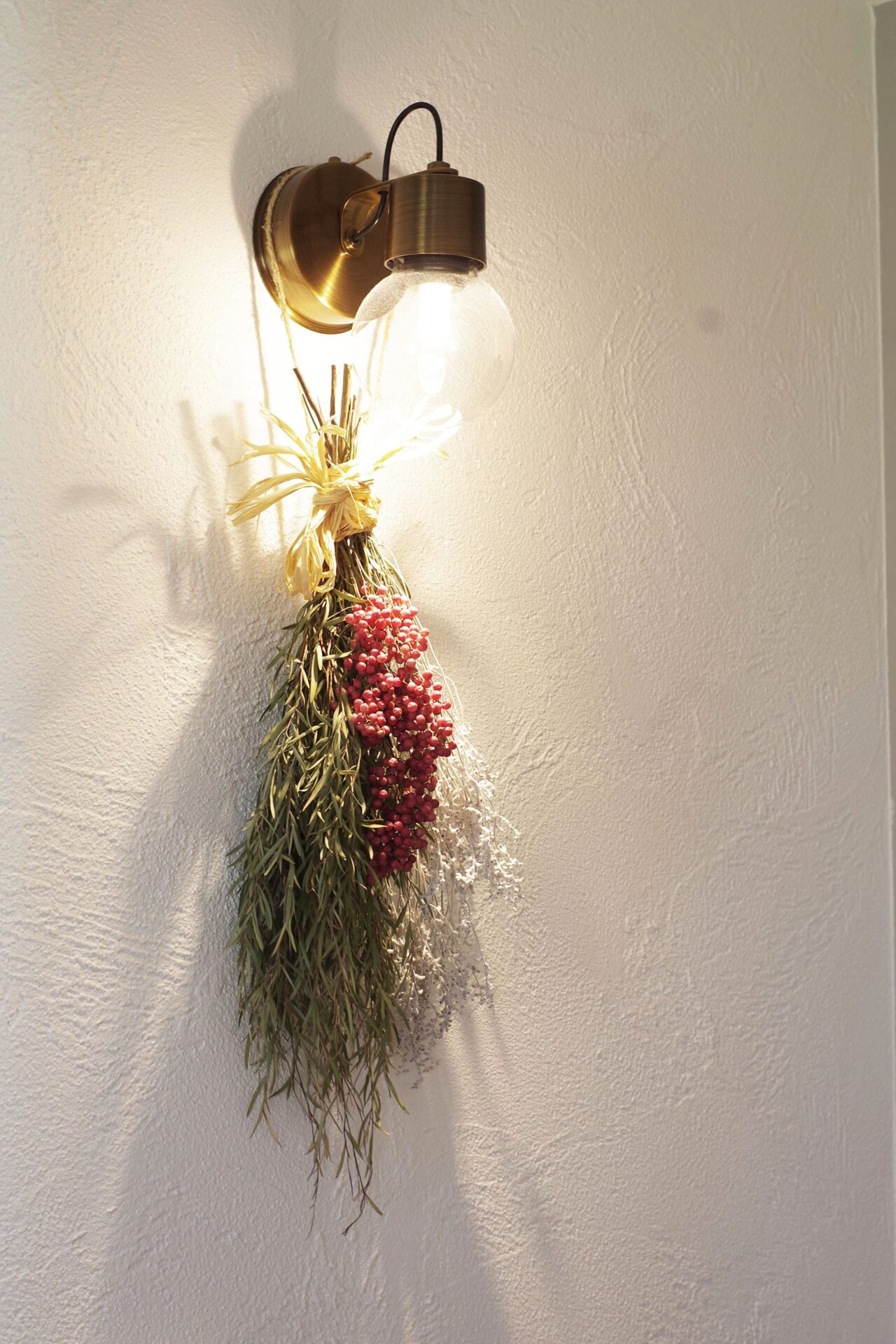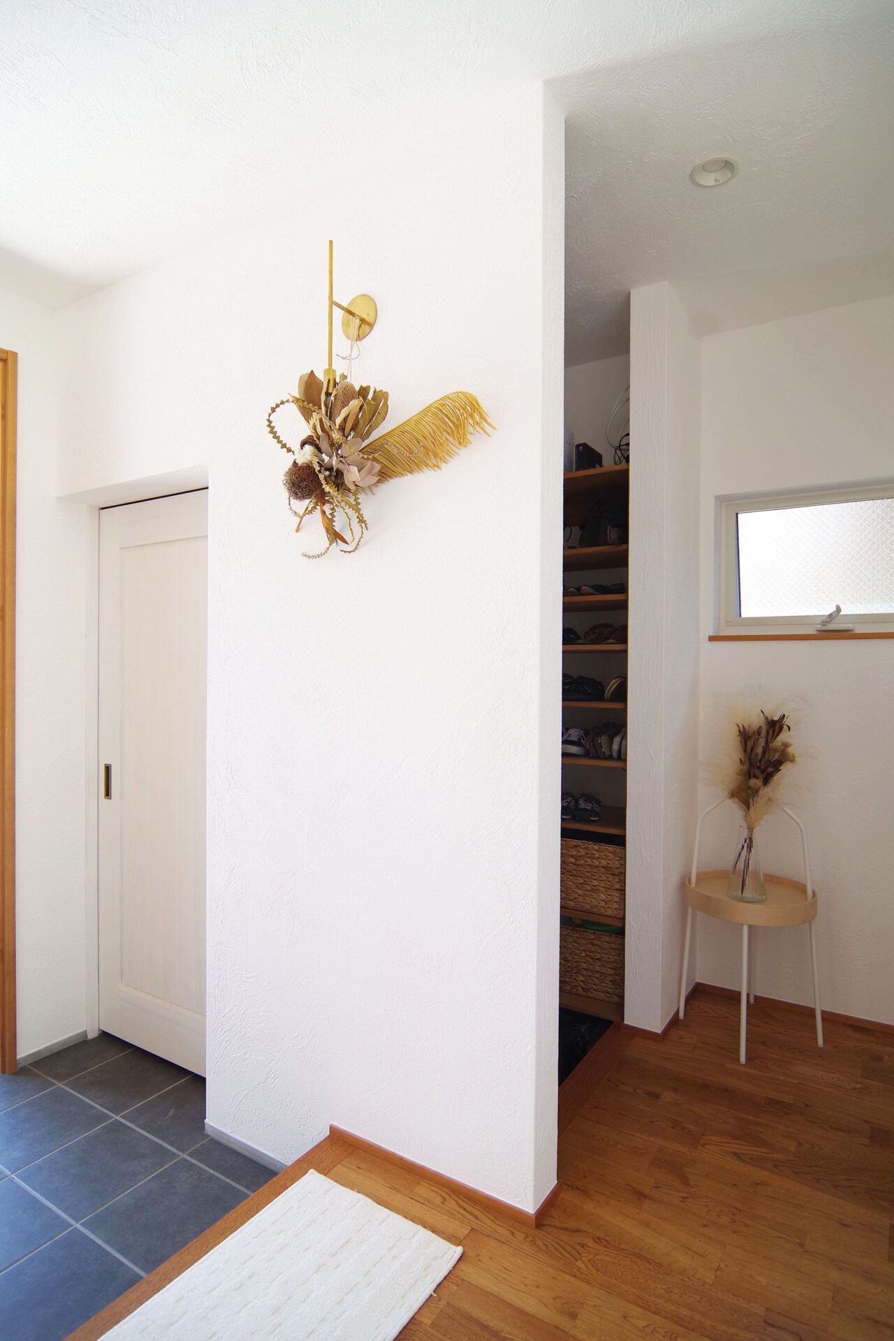 玄関ホールに飾られたスワッグにオーナ様のセンスが光ります。漆喰の壁が引き立たせてくれます。