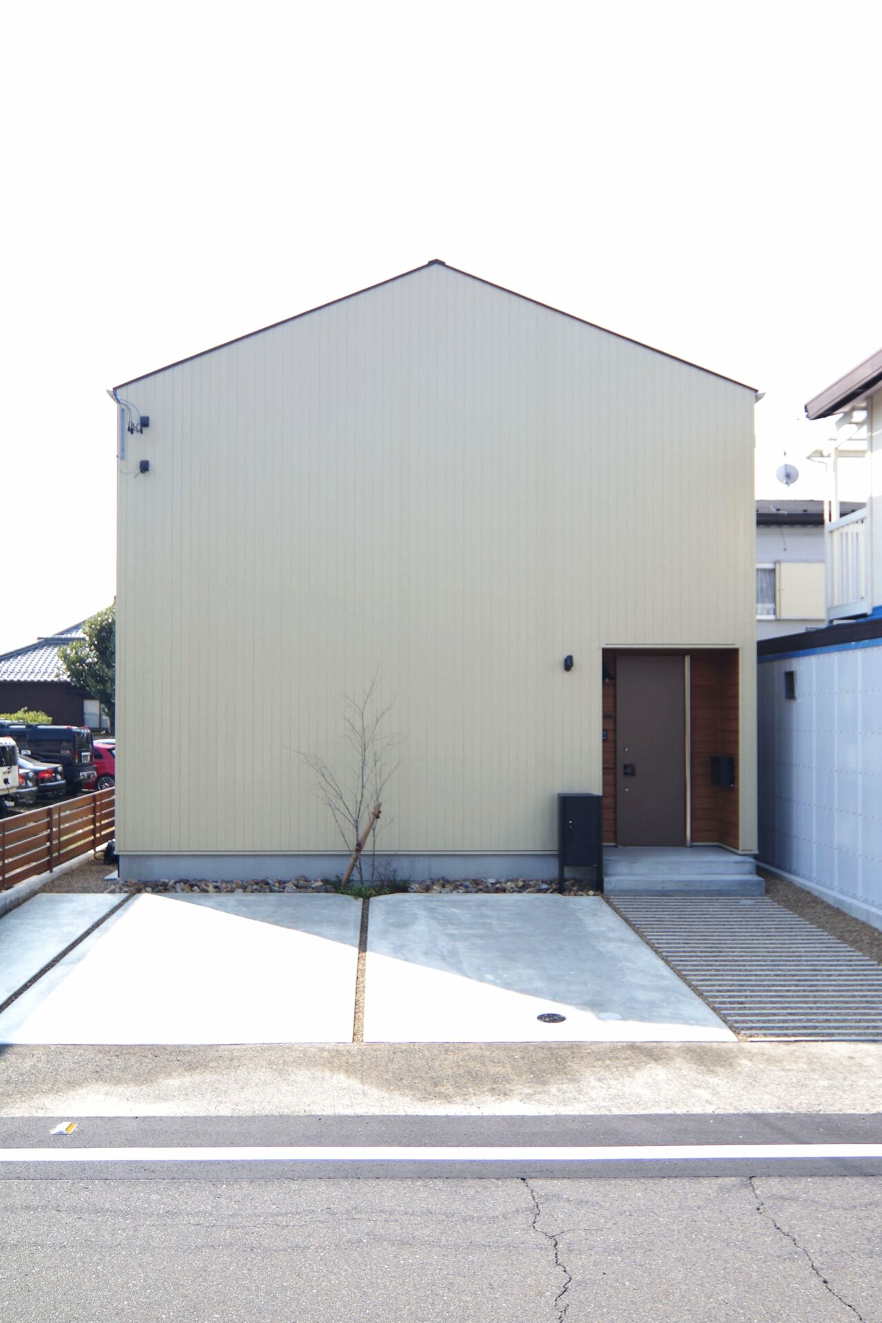 三角屋根のかわいいフォルムの外観は、道路側に窓をなくしたつるんとしたデザインにしたのがT様のこだわり。ベージュのガルバリウム鋼板の外壁に、無垢のレッドシダーを玄関周りに少しだけ使ったのも素敵。シンプルだけどどこか温もりのある佇まいになりました。