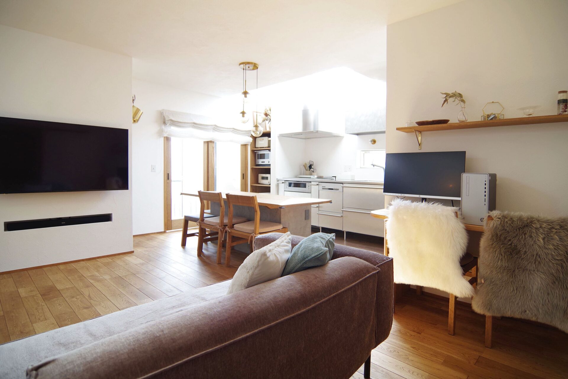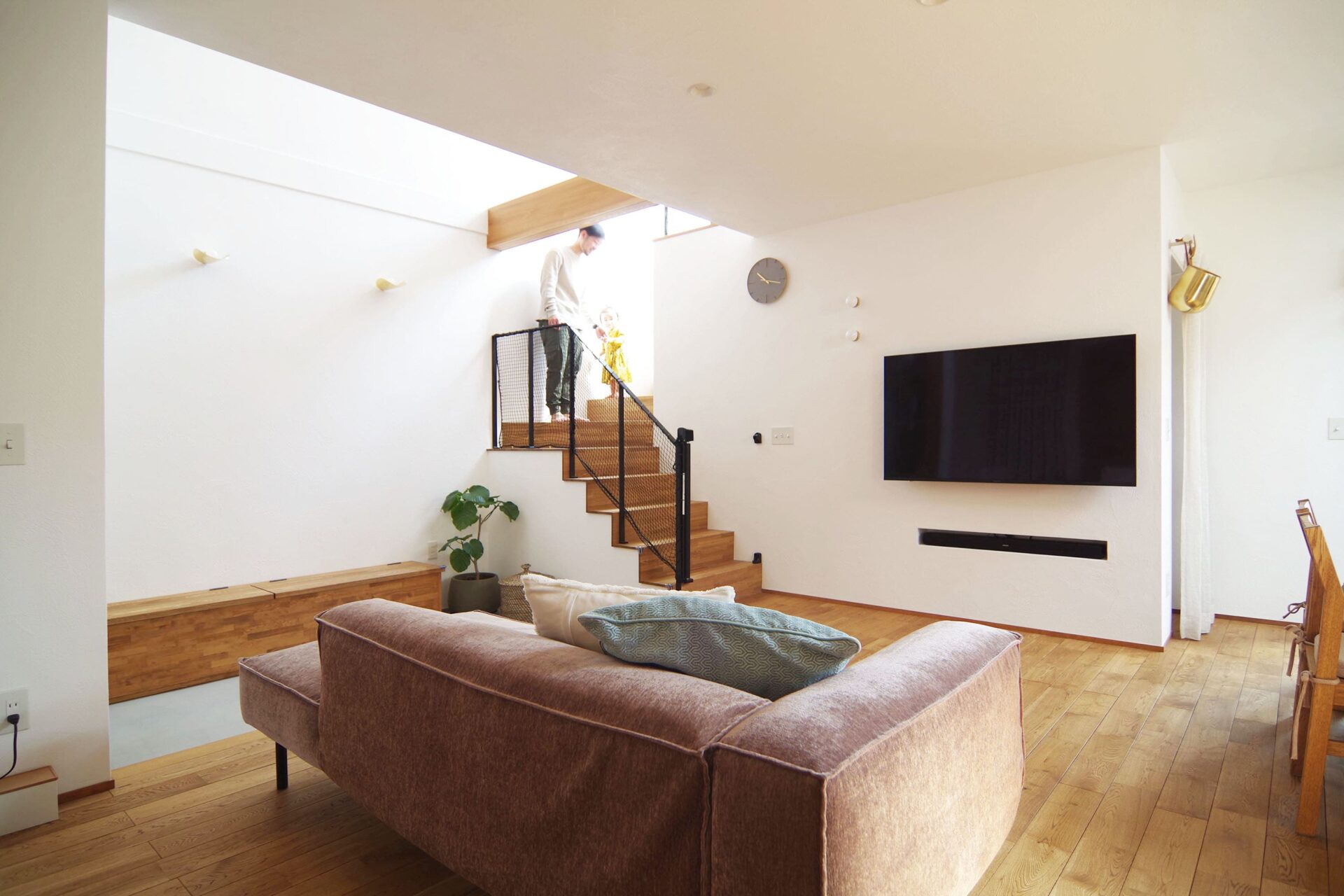 TVを取り付けた壁の向こうは、リビングで散らかりがちなものを収納できるスペースに。この空間を利用して、スピーカーが収まるニッチを造り、TV以外の凹凸がでないようにしました。