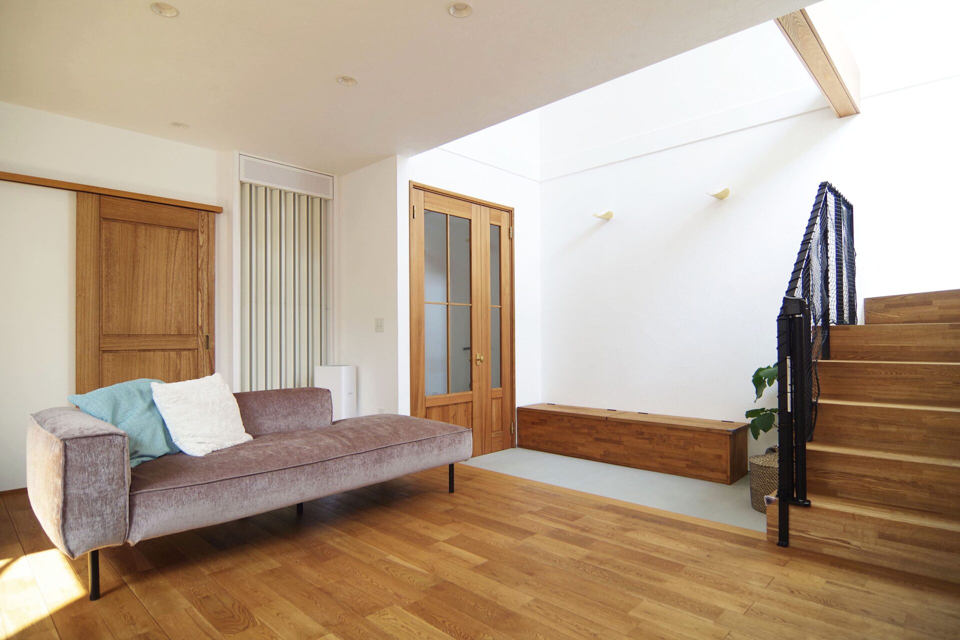 白いパネルは全館冷暖房「温ったcafe」の輻射式冷暖房パネル。一台のエアコンと連動し、家全体を暖めます。ベンチは収納にもなっています。