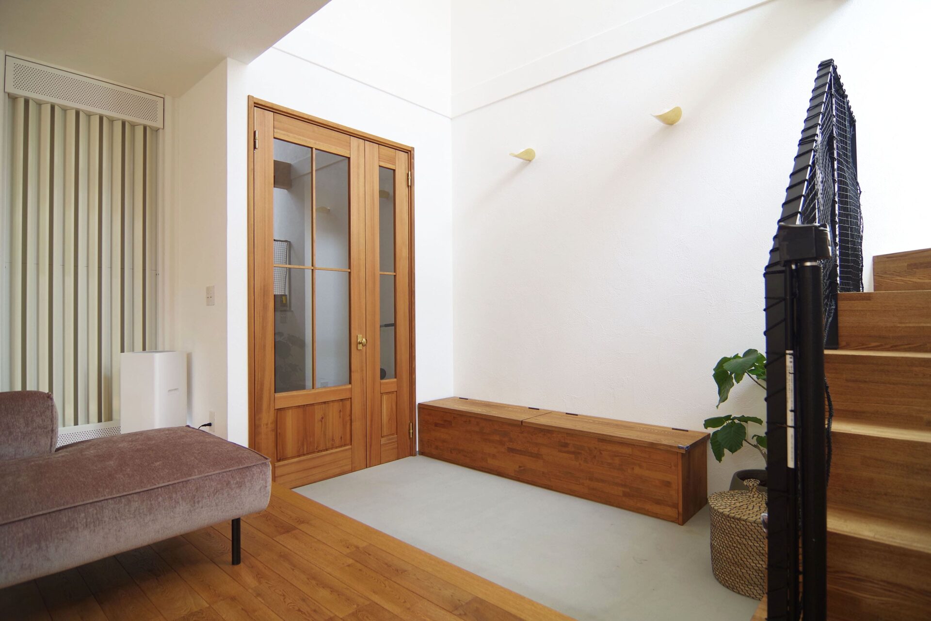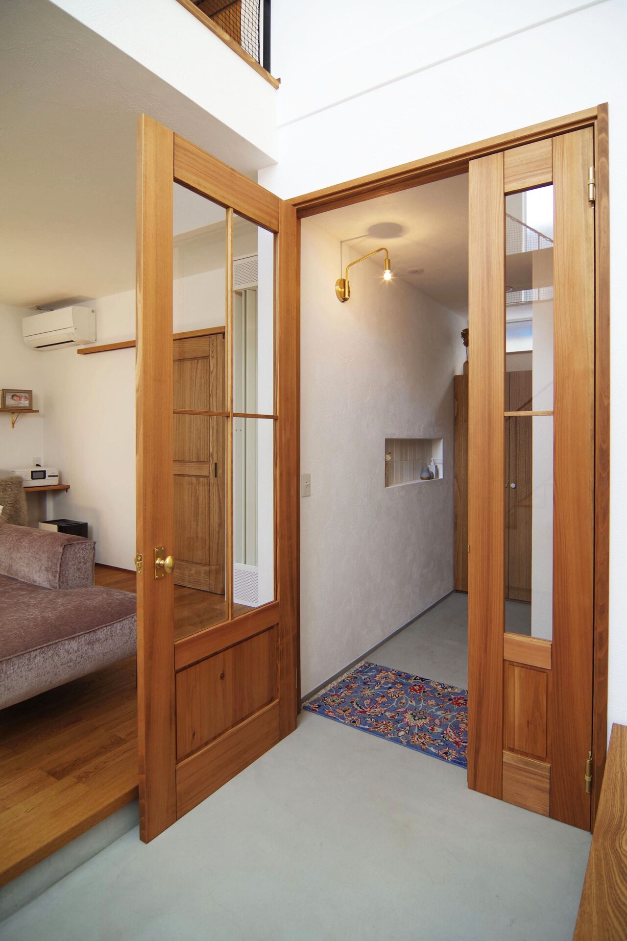 玄関と土間の間の無垢のドアは、まるで外国の家にあるような素敵なデザイン。取っ手は玄関のウォールライトと合わせて真鍮色にしています。