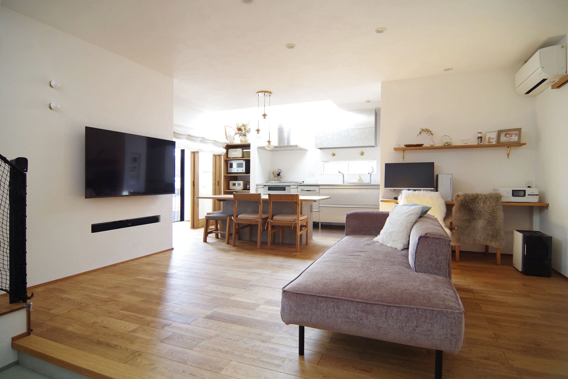 輻射式の全館空調を採用したT様の住まいは、夏も冬も穏やかな心地よさに包まれまs。吹抜を通じて2階まで快適な空気が循環するので、LDKに設置した装置1台のみで家じゅうが過ごしやすい室温になります。