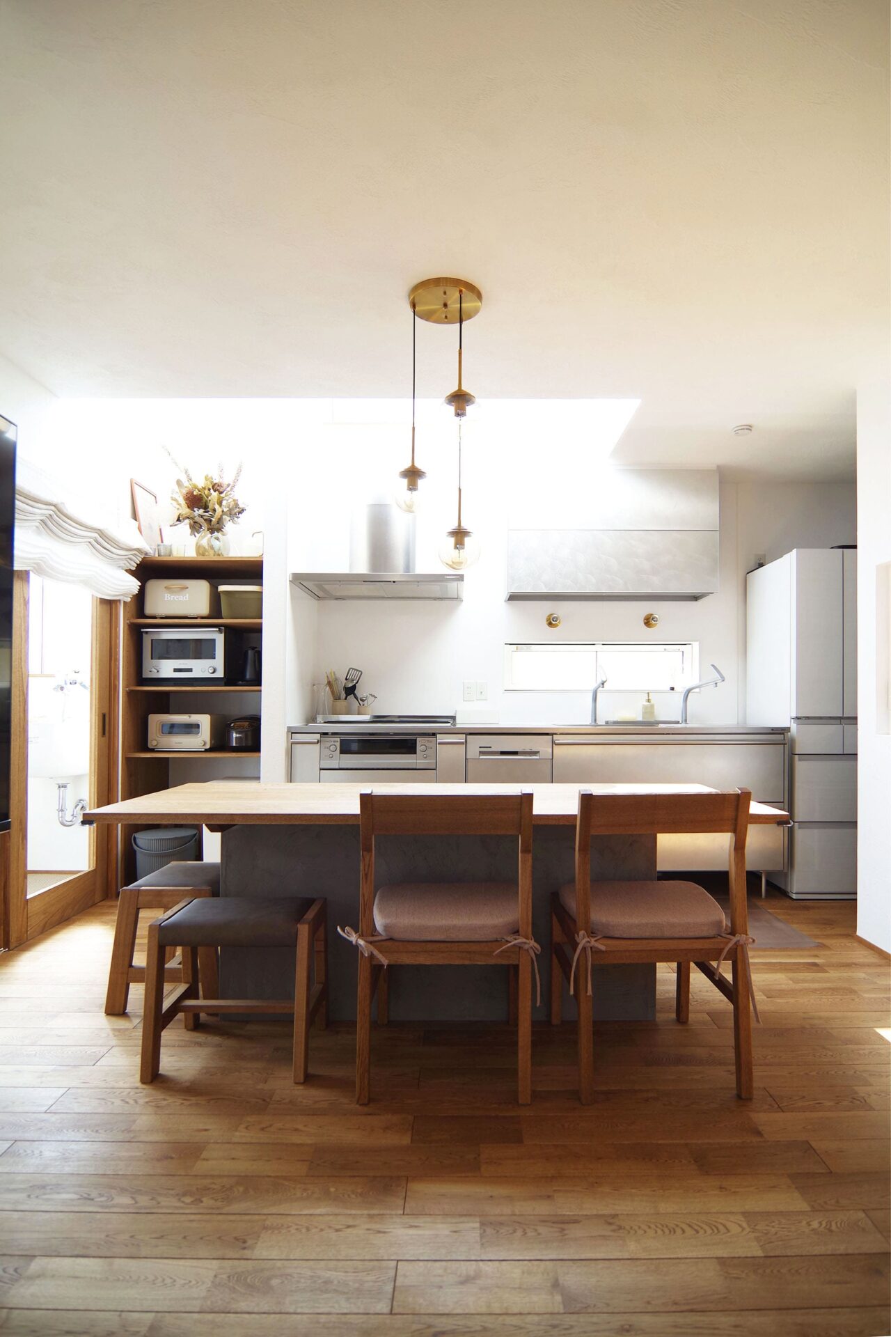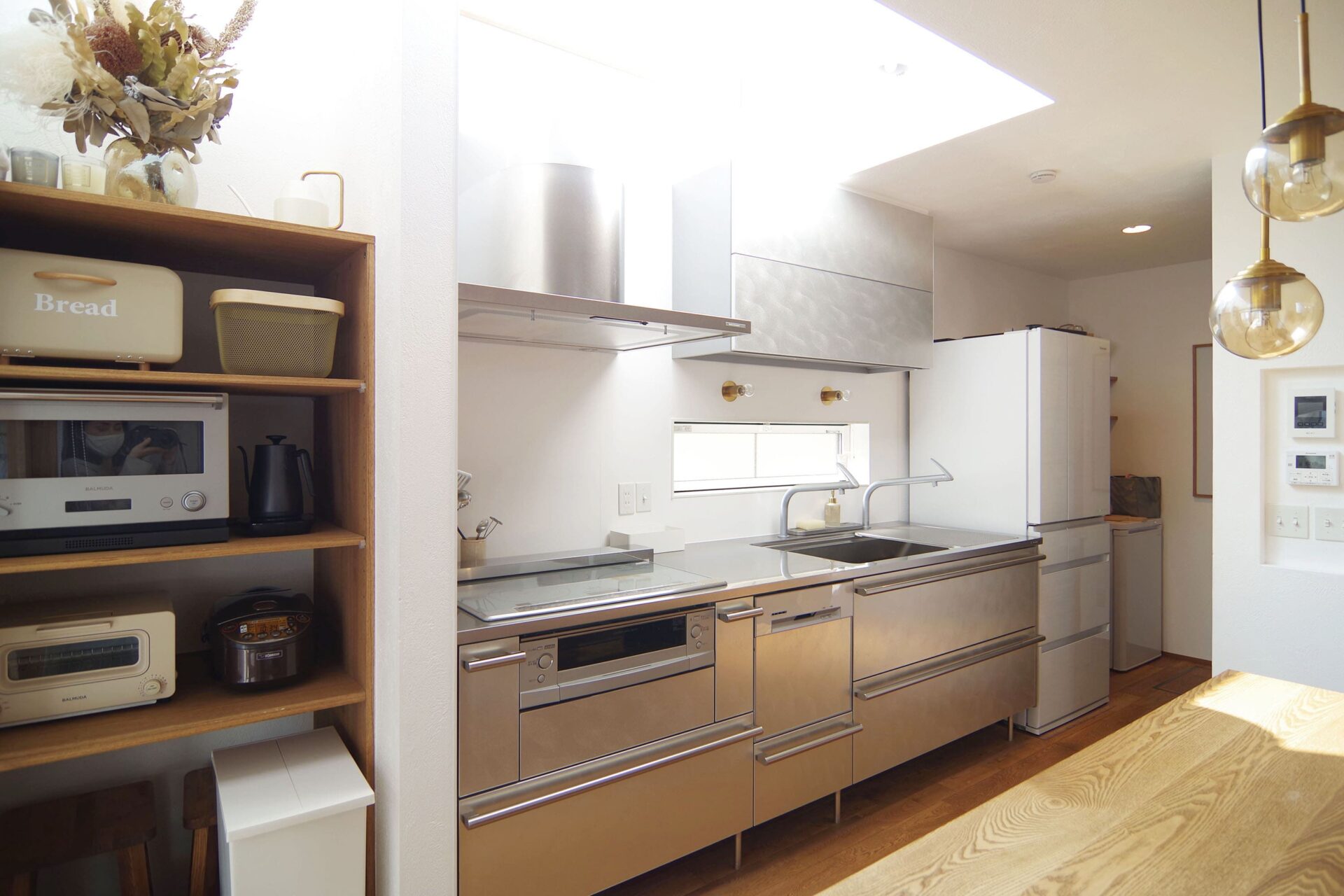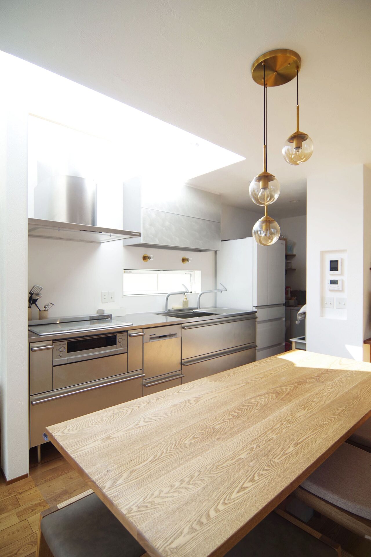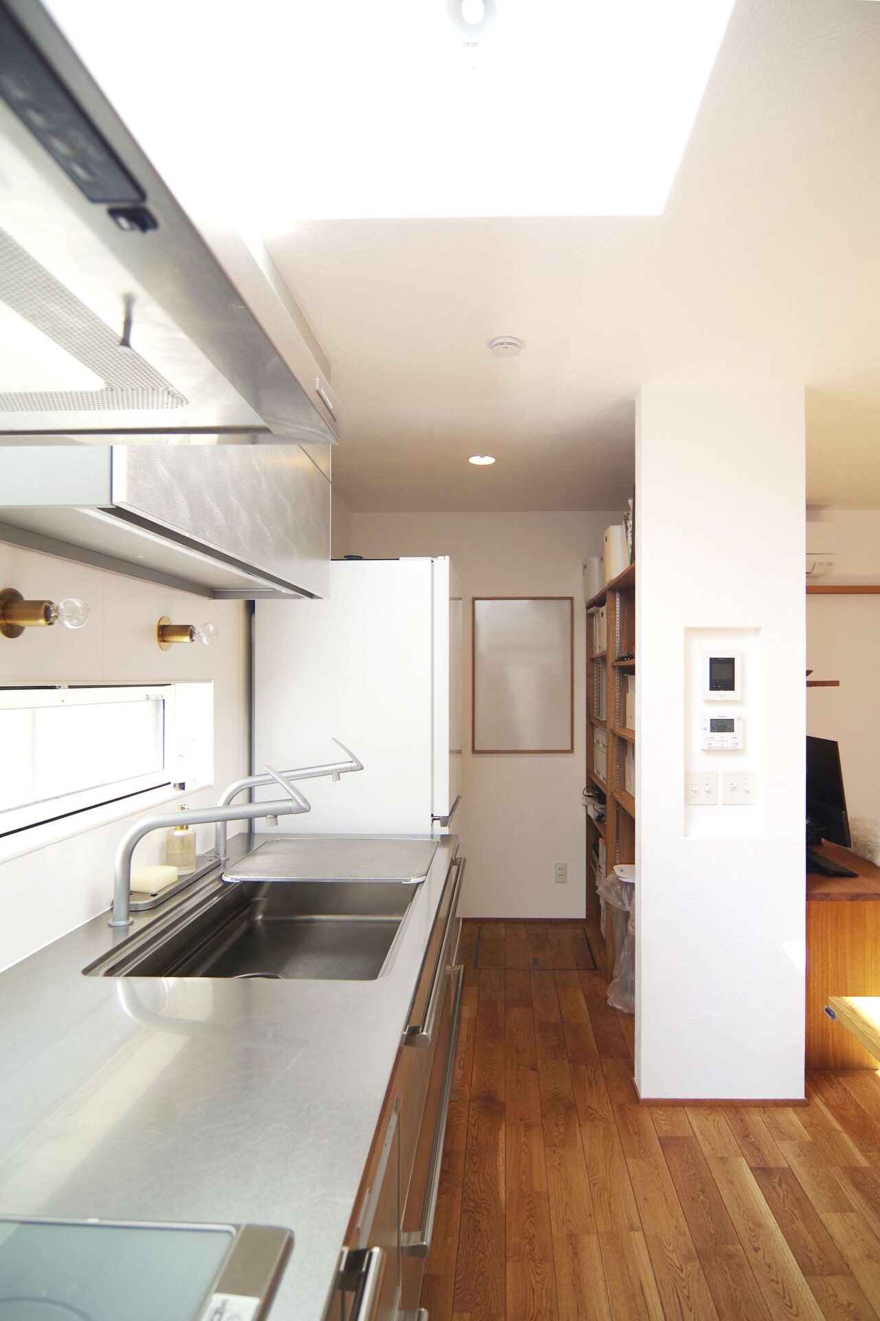 キッチンの上部を吹抜にしたことで、日差しを感じながらお料理したいという夢も叶えることができました。キッチンはステンレス製。冷蔵庫や食品のストックなどがリビング側から見えにくいようにパントリーが配置されています。