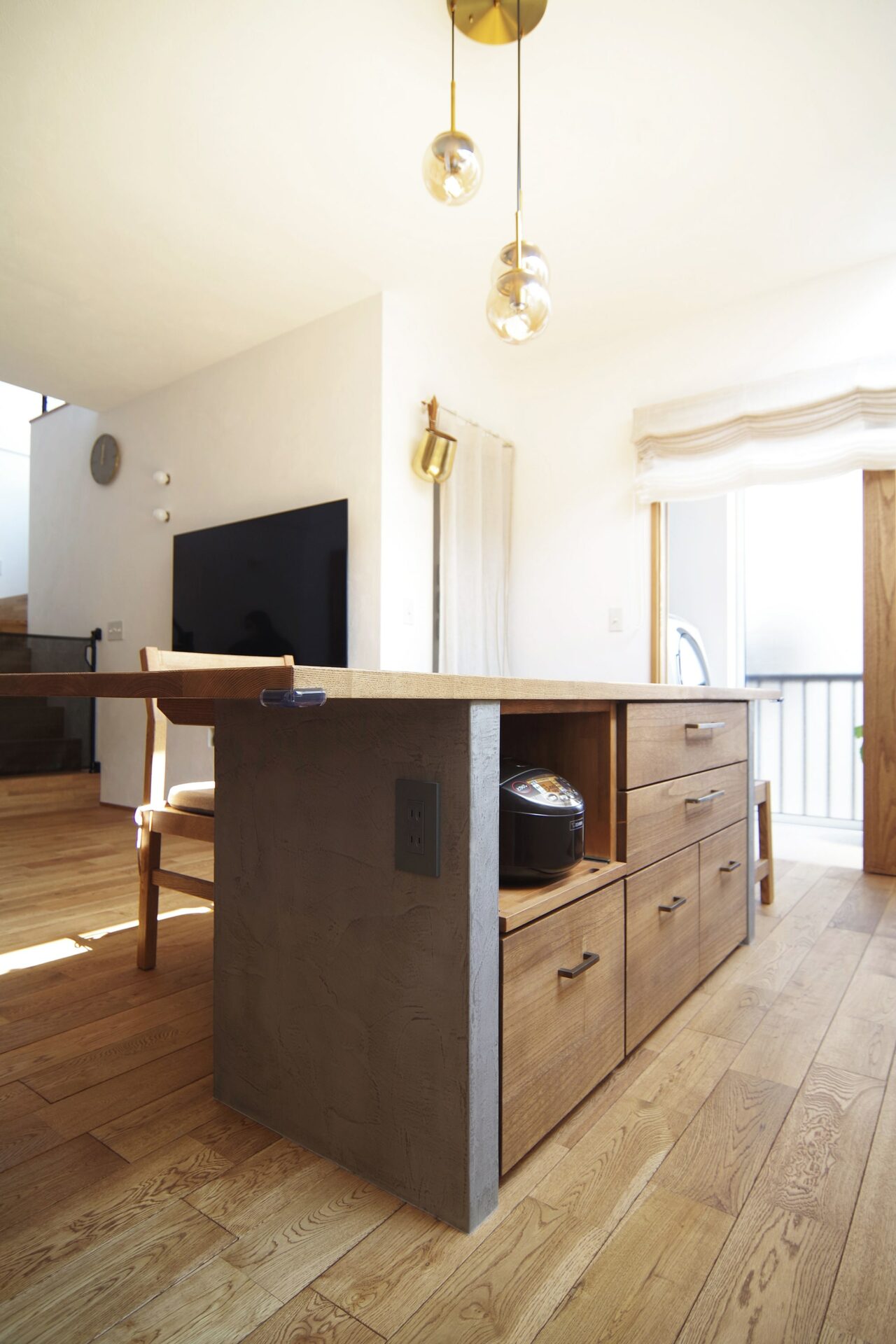 お料理が好きというT様こだわりのダイニングカウンターも無垢ストーリーの手作り。木製天板にモールテックスの組み合わせがオシャレ。周りをぐるりと回れる動きやすさも魅力です。
