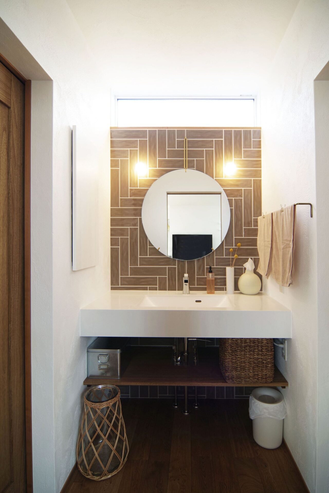 SNSを参考にしたという洗面台はタイルの張り方が特徴的。洗面室は脱衣室とセパレートし、生活感が出ないようにしています。