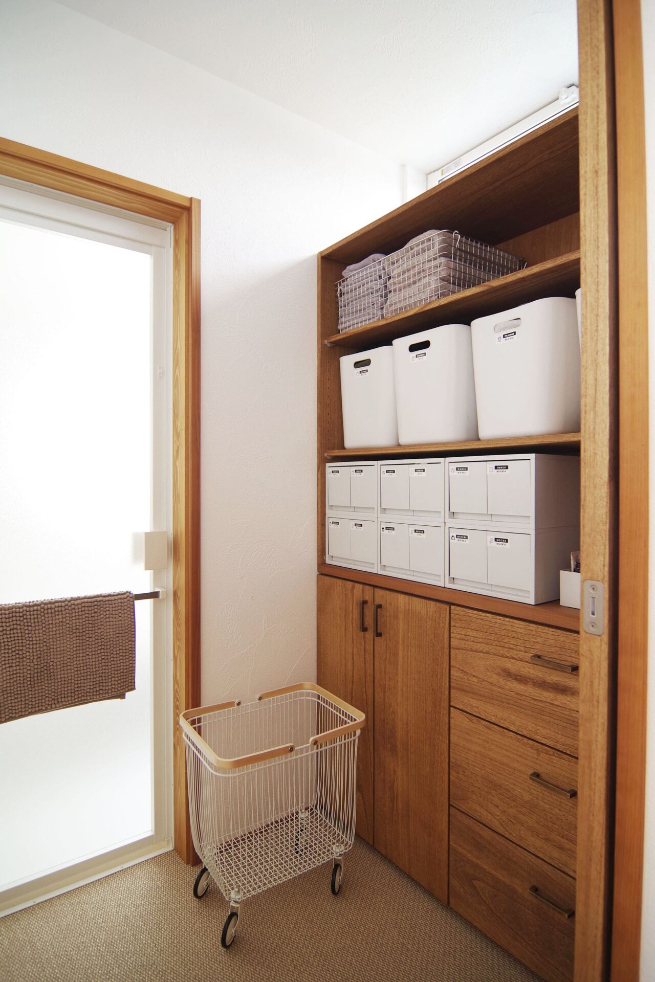 脱衣室に置かれた、無垢の桐と真鍮の取っ手を合わせた美しい収納家具。暮らしに合わせた美しい家具で住まいを彩っていくのも、自社に家具工房があるからこそ実現できます。