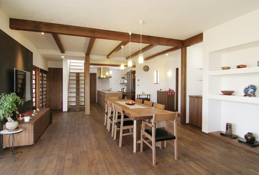大空間や大きな開口をつくれる平屋は1階部分に2階の重さがかからないため、建物の構造が安定します。耐震性も高まり、柱や壁が少ない広々とした空間や大きな開口部をつくりやすくなります。2階が無い平屋は屋根の下にある小屋裏を活用したり、勾配天井にして、開放感を演出することもできます。